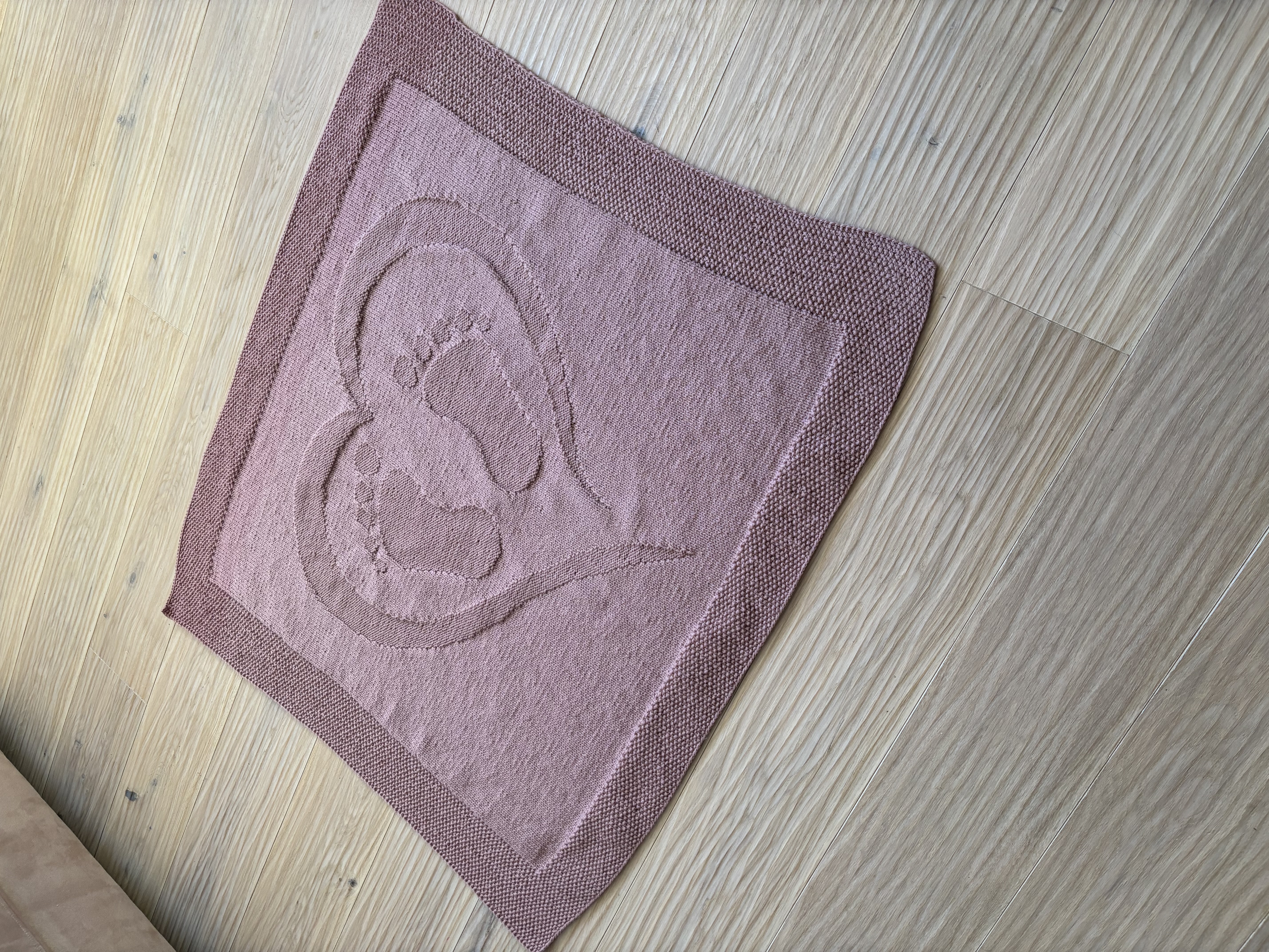Die Babydecke „I LOVE MY TEDDYBÄR“ mit vielen Herzen, Küken und Glücksklee wird nur mit rechten und linken Maschen gestrickt.