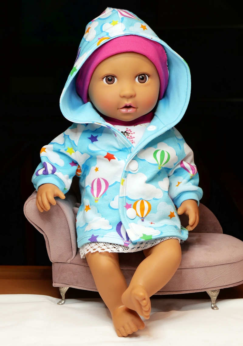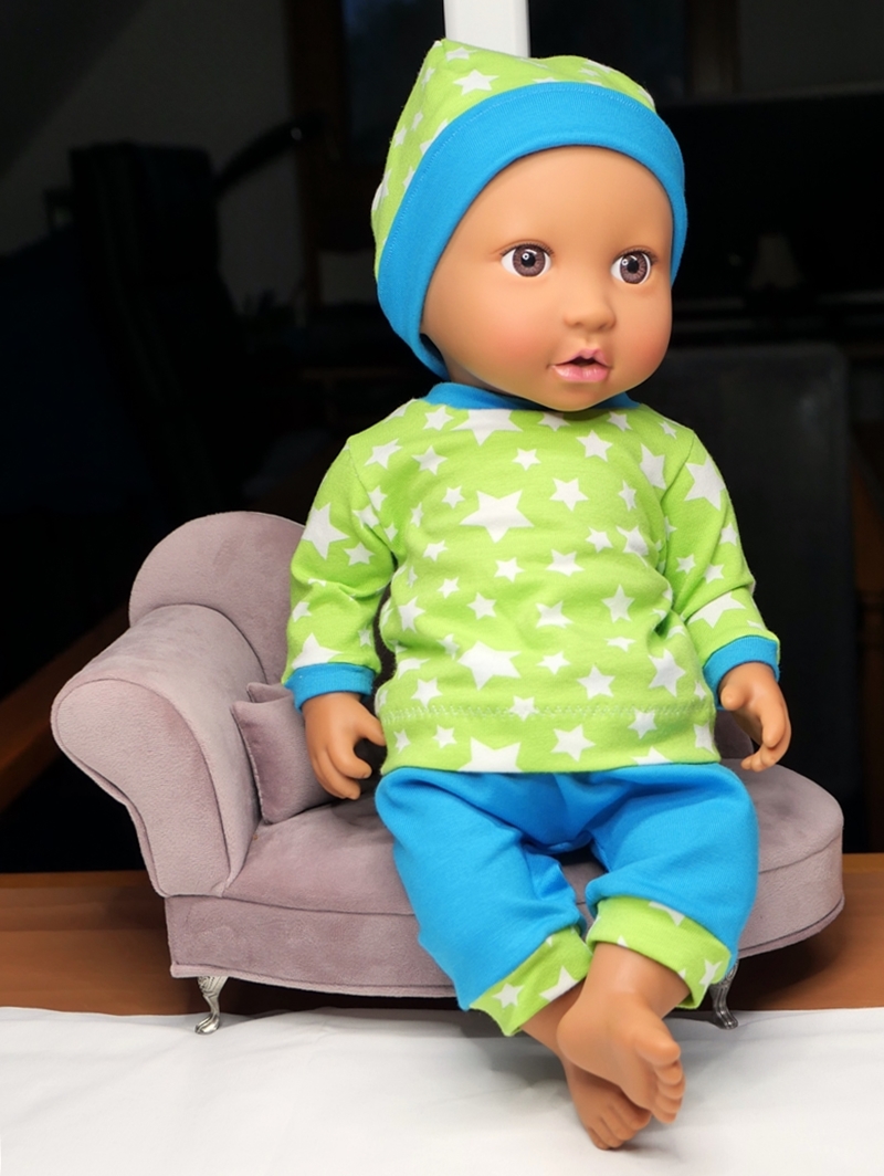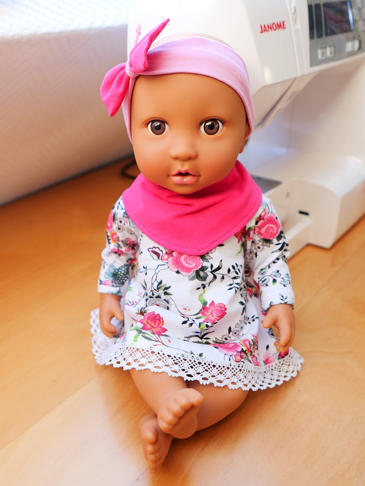 meine kleine Enkelin hat eine Babyppe zum Geburtstag geschenkt bekommen. Sie hatte nur die Kleidung an, die sie beim Kauf trug. Deshalb habe ich für ihre Puppen Sachen genäht. Und weil ich wollte, dass die Sachen auch passen, sie mir die Puppe aber nicht ausgeliehen hätte, habe ich mir die gleiche (17 Euro, das kann man machen) gekauft. Nun haben wir Puppengeschwister und können damit auch schön zusammen spielen.