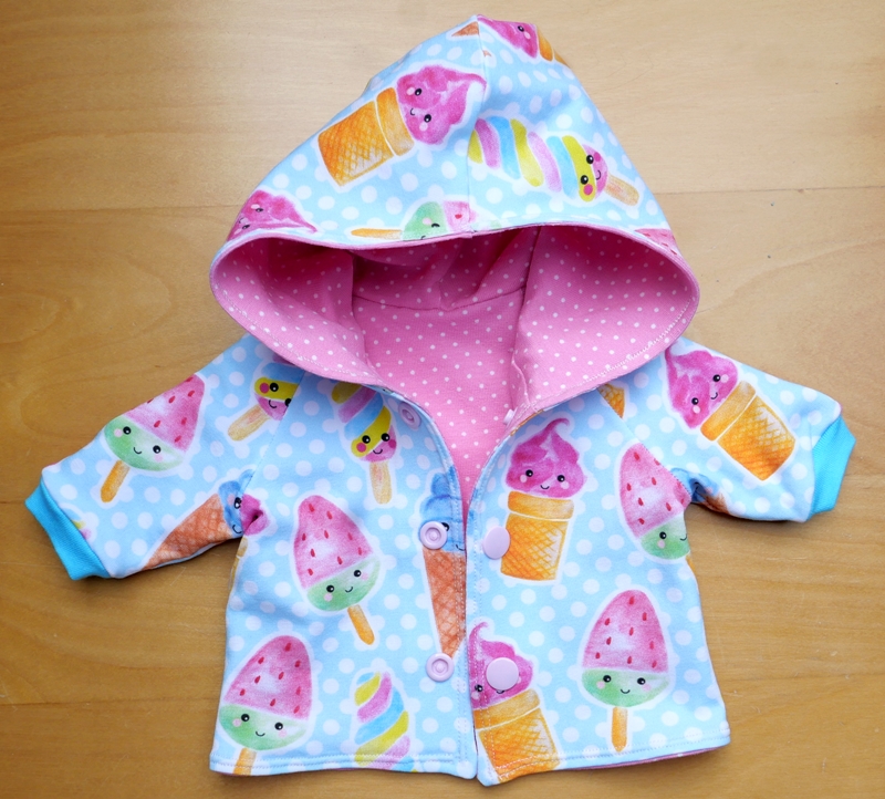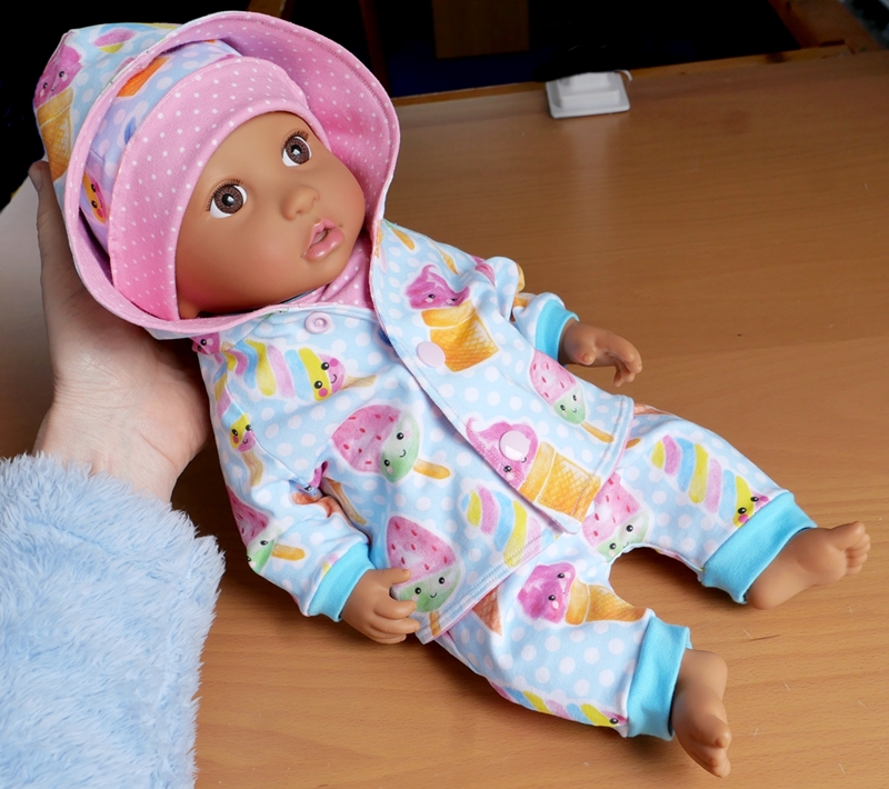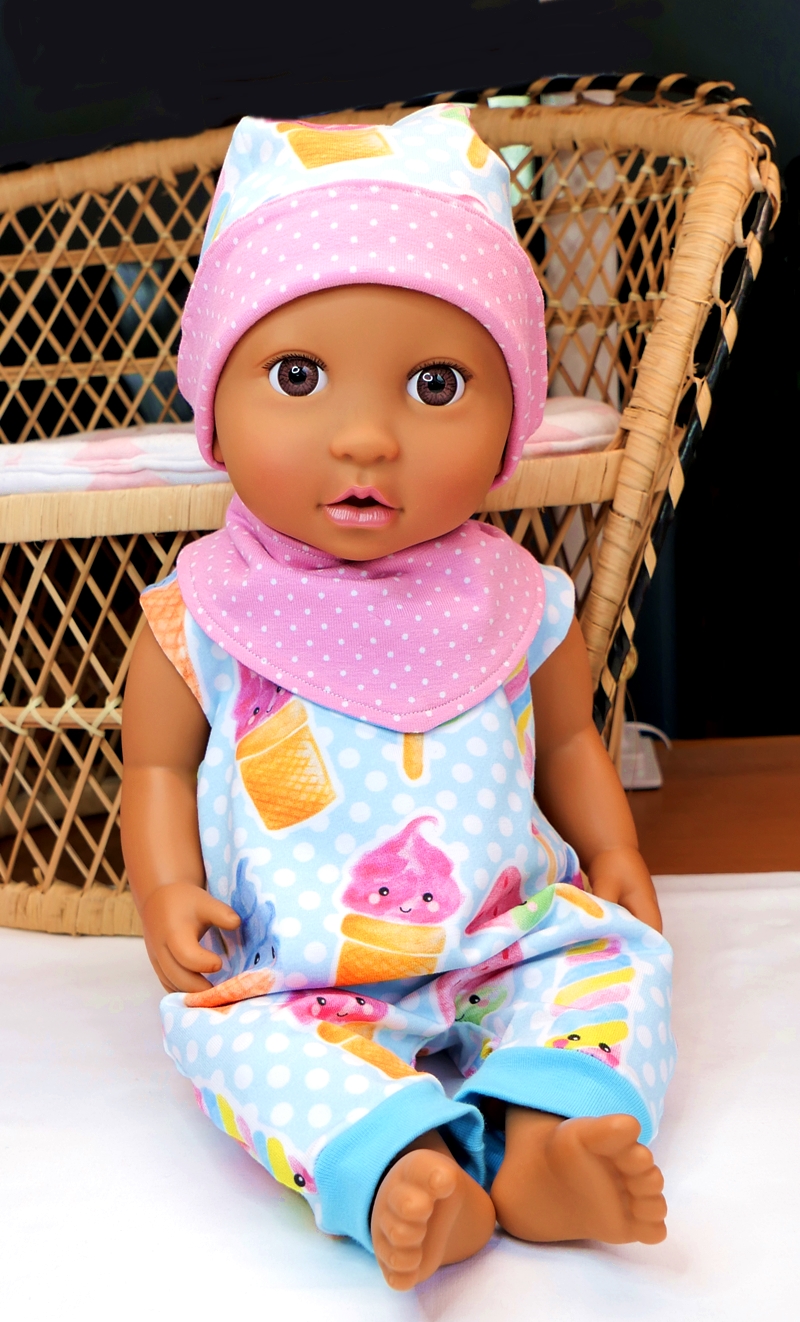 Es hat mir sehr viel Freude gemacht. Immer, wenn ich ein Teil fertig hatte, hatte ich Lust ein weiteres zu nähen, was zu dem anderen passt. Und da es nur wenig Stoff braucht, kann man sich reichlich austoben. Niemals wird eine Puppenmutti sagen, das ist zu viel, da wächst sie raus. Und ich habe auch Sachen im Partnerlook genäht. Der Stoff mit dem Eis drauf, daraus hatte ich meiner Enkelin auch ein Kleidchen genäht, was ihr Lieblingskleid ist. Deshalb wird ihr das besonders gut gefallen.
