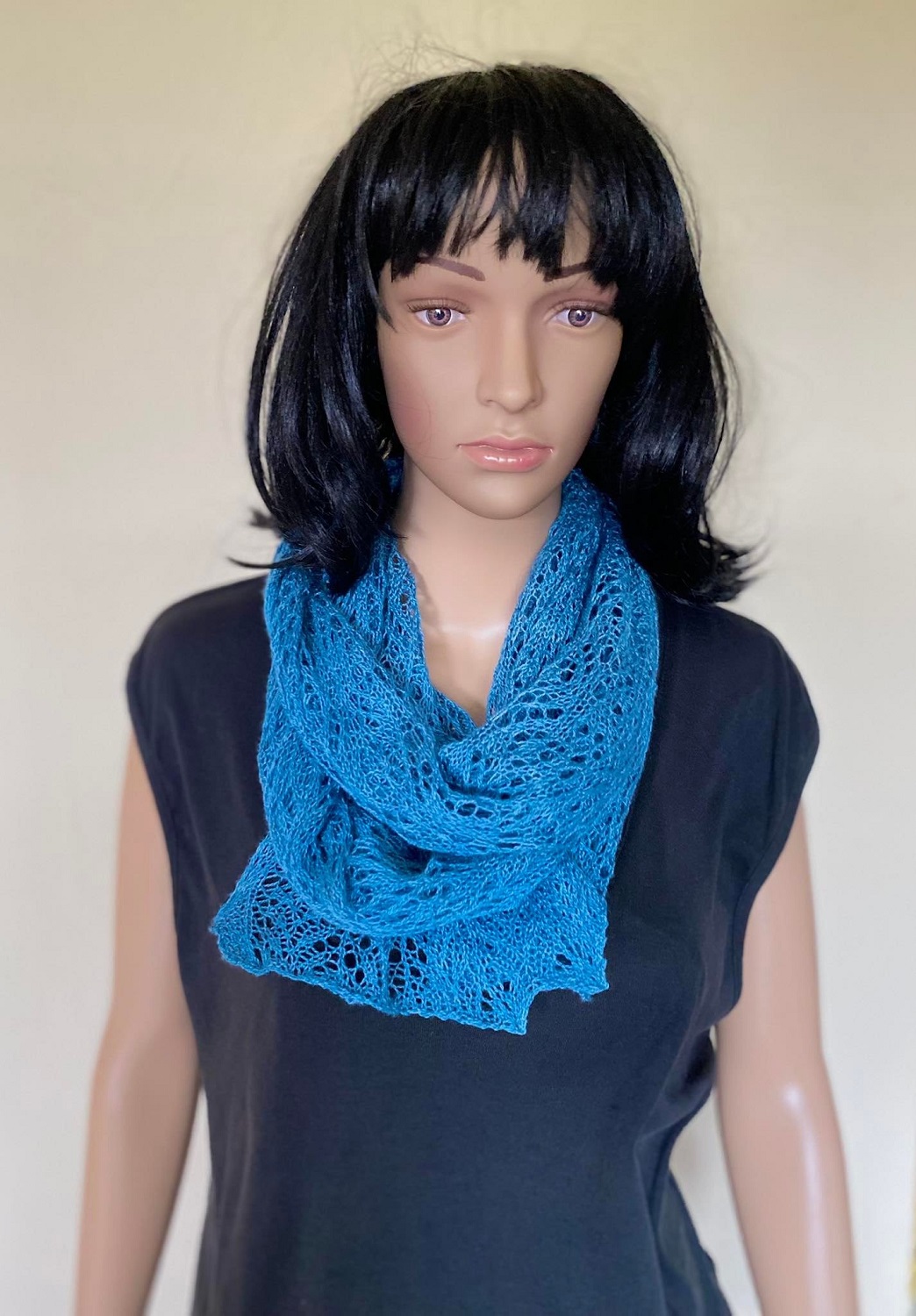 Ein leichter Sommerschal aus nur 100g Lacewolle  gestrickt in der Wohlfühlfarbe Blau, das ist immer Trend.