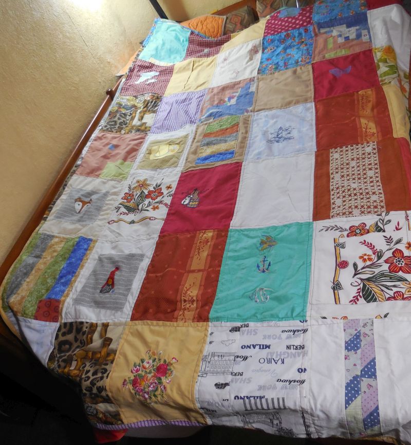 ich hatte jede Menge selber genähte Einkaufsbeutel die mir irgengwann zuviel wurden. Also bin ich her hab alle Beutel ausnander genommen und die Seiten die ich verwenden wollte auf ein einheitliches Maß gebracht und zusammengesetzt zu einem Quilt. Die Decke war noch warm von der Nähmaschine, als meine eine Tochter ihn sich schon einverleibte und meinte der passt gut in mein Auto :-)