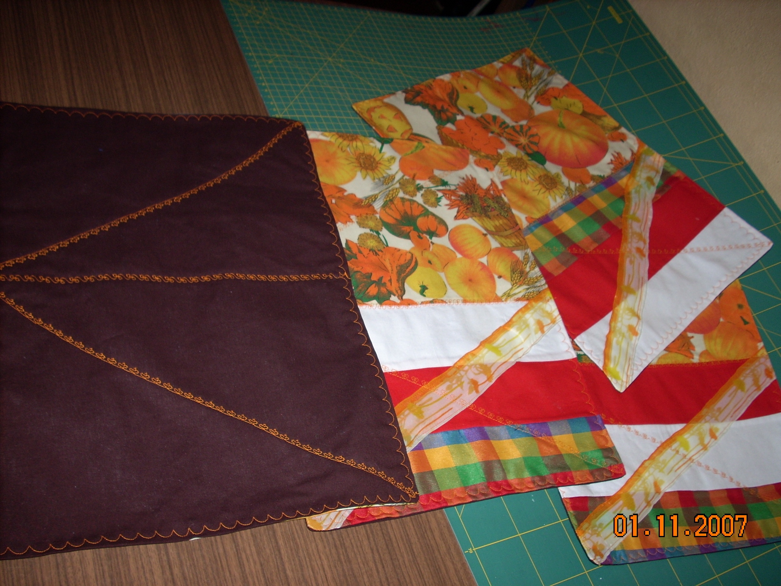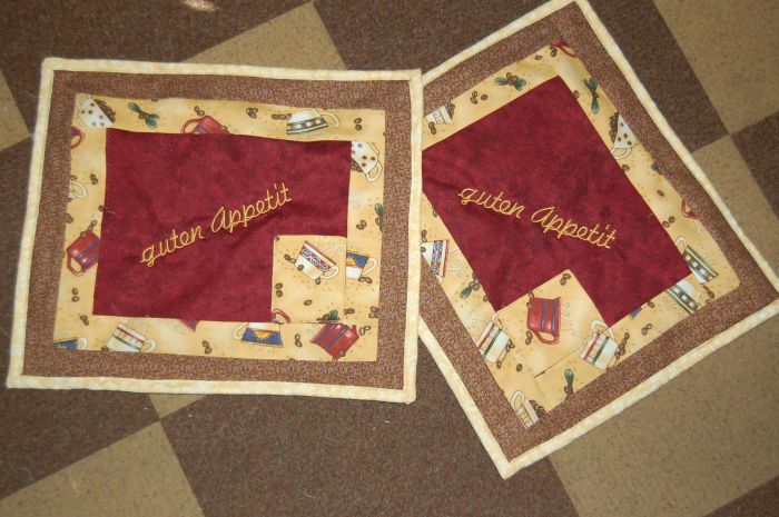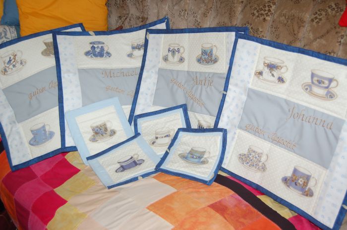 die Tischsets habe ich alle mal vor über 10 Jahren genäht, die mit den blauen Tassen waren mal ein Geschenk an meine jüngste Tochter, die mit den Kürbissen schleppte meine Schwester mal ab und die mit der Inschrift Guten Appetit blieben dann bei mir :-)))