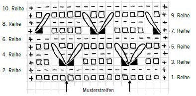 7.-10. wie die Reihen 3-6 - nur um 4 Maschen versetzt