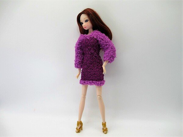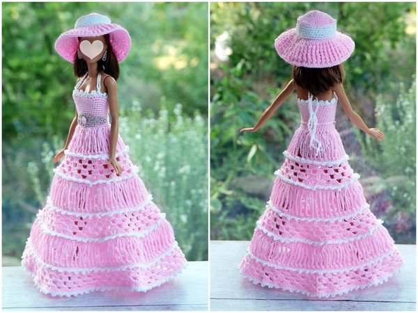 Das Kleid wird in einem Stück gehäkelt. Es gibt eine Häkelschrift. Der Tüll-Unterrock wird unter das Kleid genäht. Dann noch nach Belieben das Kleid verzieren. Ihr könnt es selbstverständlich auch in anderen Farben häkeln. Vielleicht mögen die Puppen ja mal tauschen, bevor sie auf den großen Ball mit dem Prinzen gehen.