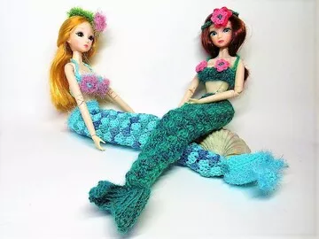 Beim Meerjungfrau-Outfit für Modepüppchen kannst du so richtig in Aqua-Tönen schwelgen. Links siehst du das Outfit in Türkis-Hellblau-Tönen gehalten, rechts in Grüntönen.