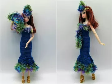Und hier noch ein Traum in Blau: Das Abendkleid Pfauenprinzessin steht allen Püppchen, egal welcher Haarfarbe. Am Saum wurde mit etwas Fransengarn gehäkelt, dadurch wirkt er wie aus Federn gemacht. Dazu gibt es die Anleitung für den Kopfschmuck und den Fächer.