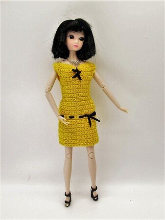 Puppenkleid mit Wasserfallausschnitt ist schnell aus einem Wollrest gehäkelt. In der Anleitung findest du noch weitere Variationen dieses Kleids: mit Fransen und Lochmusterblende oder Faltenrock. Du kannst also mit dieser Häkelanleitung viele verschiedene Kleidchen für Modepuppen häkeln.