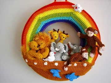 sieht man viele verschiedene Tiere unter einem Regenbogen. Dieses Häkelprojekt ist sehr abwechslungsreich und wird dir sicher viel Spaß machen. Der Türkranz hat einen Durchmesser von 25 cm und ist ein tolles Geschenk zur Taufe oder zur Geburt.