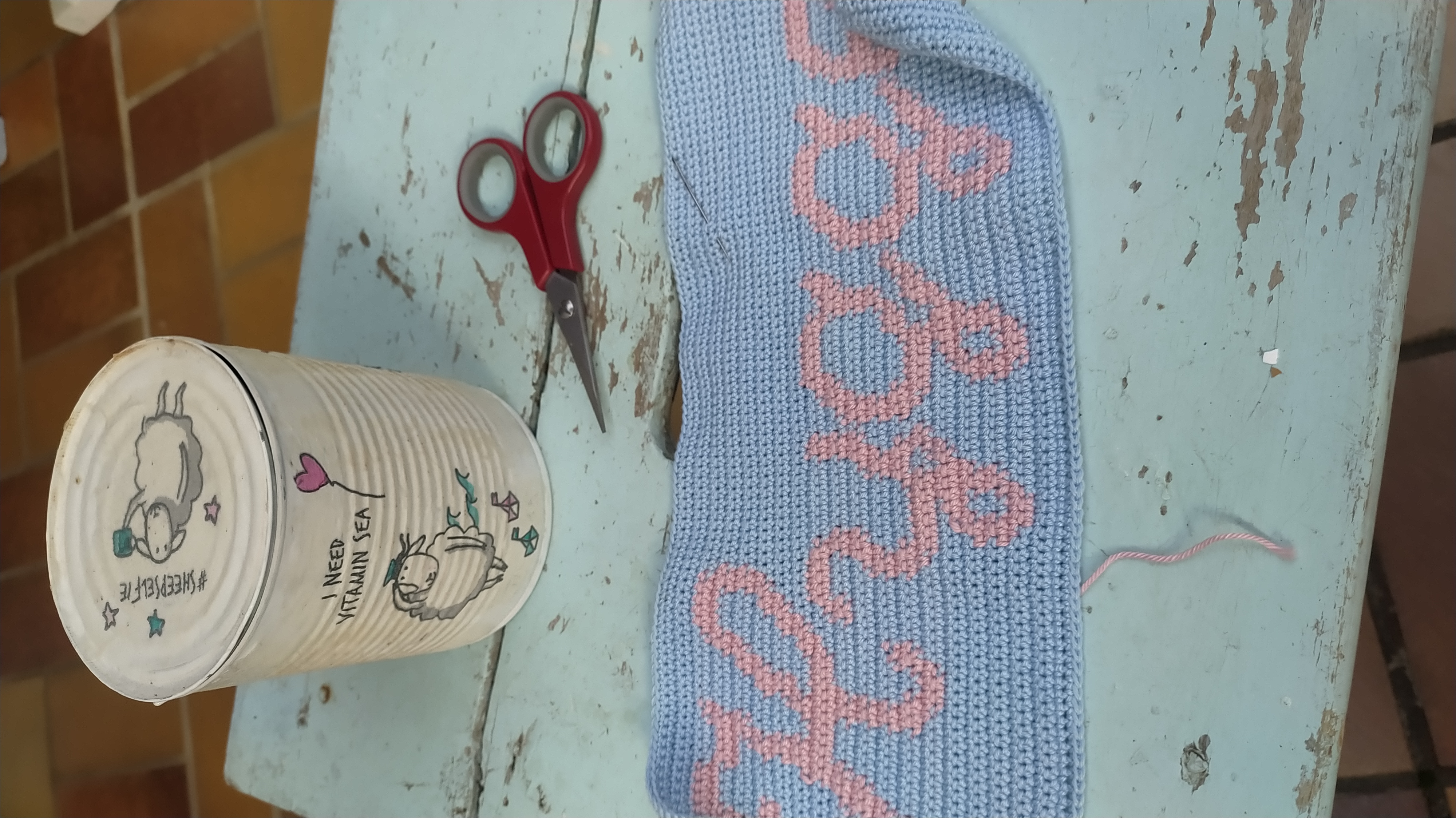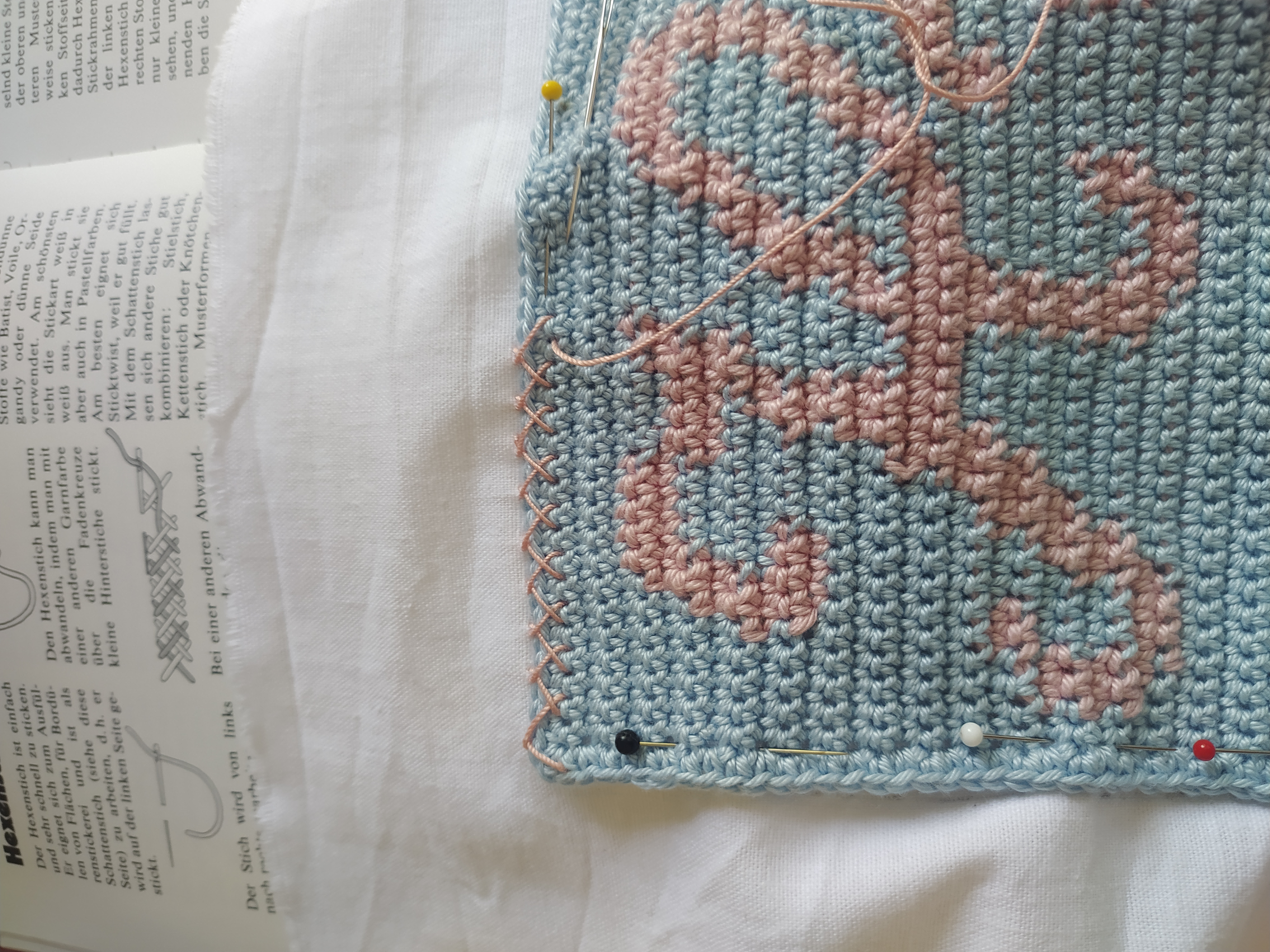 Neuer Monat, weiter geht's. Ich Nähe meine Häkelarbeit auf einen Baumwollstoff mit einem Hexenstich.