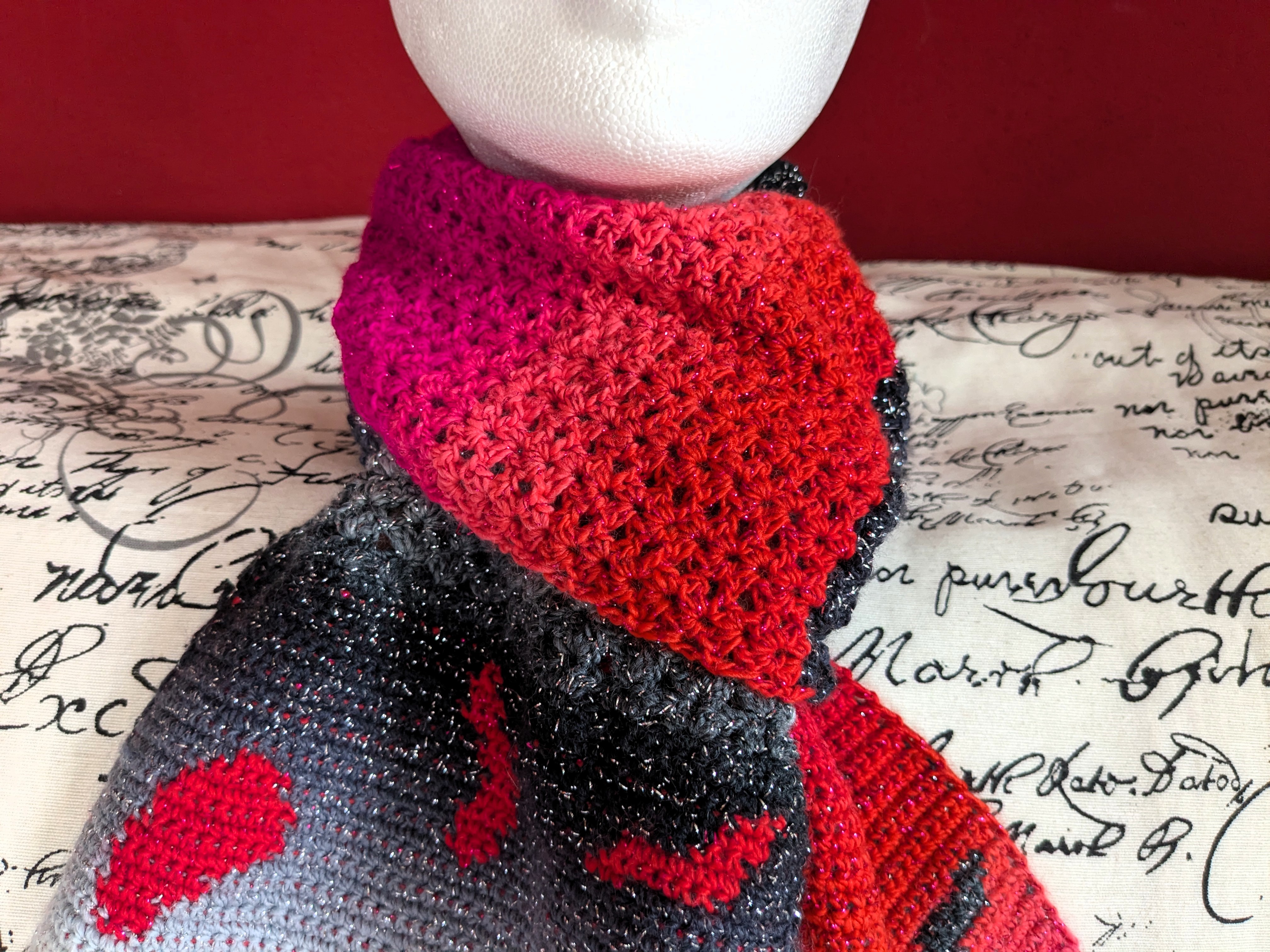 Gehäkelt wurde mit einem 4-fädigen Bobbel in hellgrün mit einem Farbverlaufsfaden (Konfettifaden oder Harlekinfaden) und mit Nadelstärke 3.