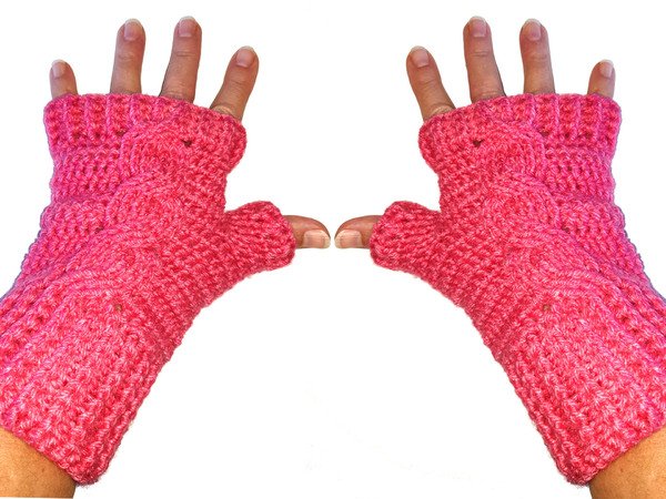 Handstulpen „Rapünzchen“ besitzen auf der Handoberseite ein gehäkeltes Zopfmuster.