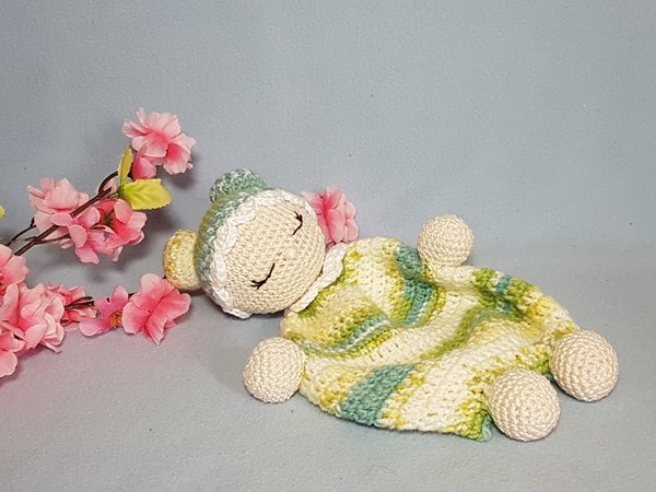 Kuschelhase Hoppel kann als Hasenjunge oder als Hasenmädchen (mit aufgestickten Wimpern - siehe Bild) gearbeitet werden. Für die Innenohren habe ich einen farblich passenden Stoff auf die gehäkelten Ohren genäht.