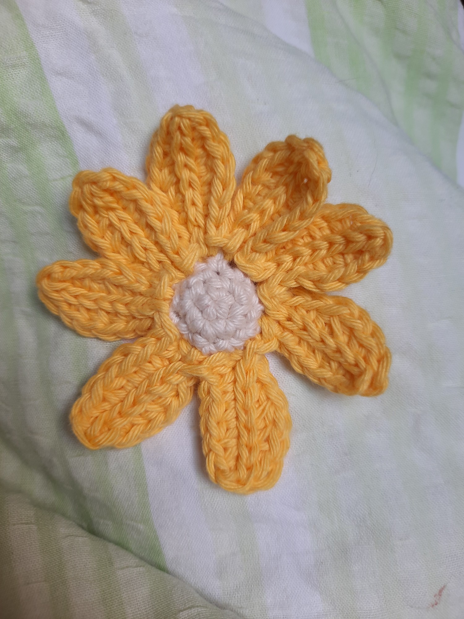 bevor ich mir jetzt hier  Blumenanleitungen kaufe, wollte ich eine kostenlose Blüte aus dem Netz häkeln. Hm ja, hat gar nicht mal so gut geklappt, es sollten 8 Blütenblätter werden und ich hatte irgendwie noch 1 M zuviel übrig, jetzt ist da ne kleine Lücke zwischen den Blütenblättern... naja.