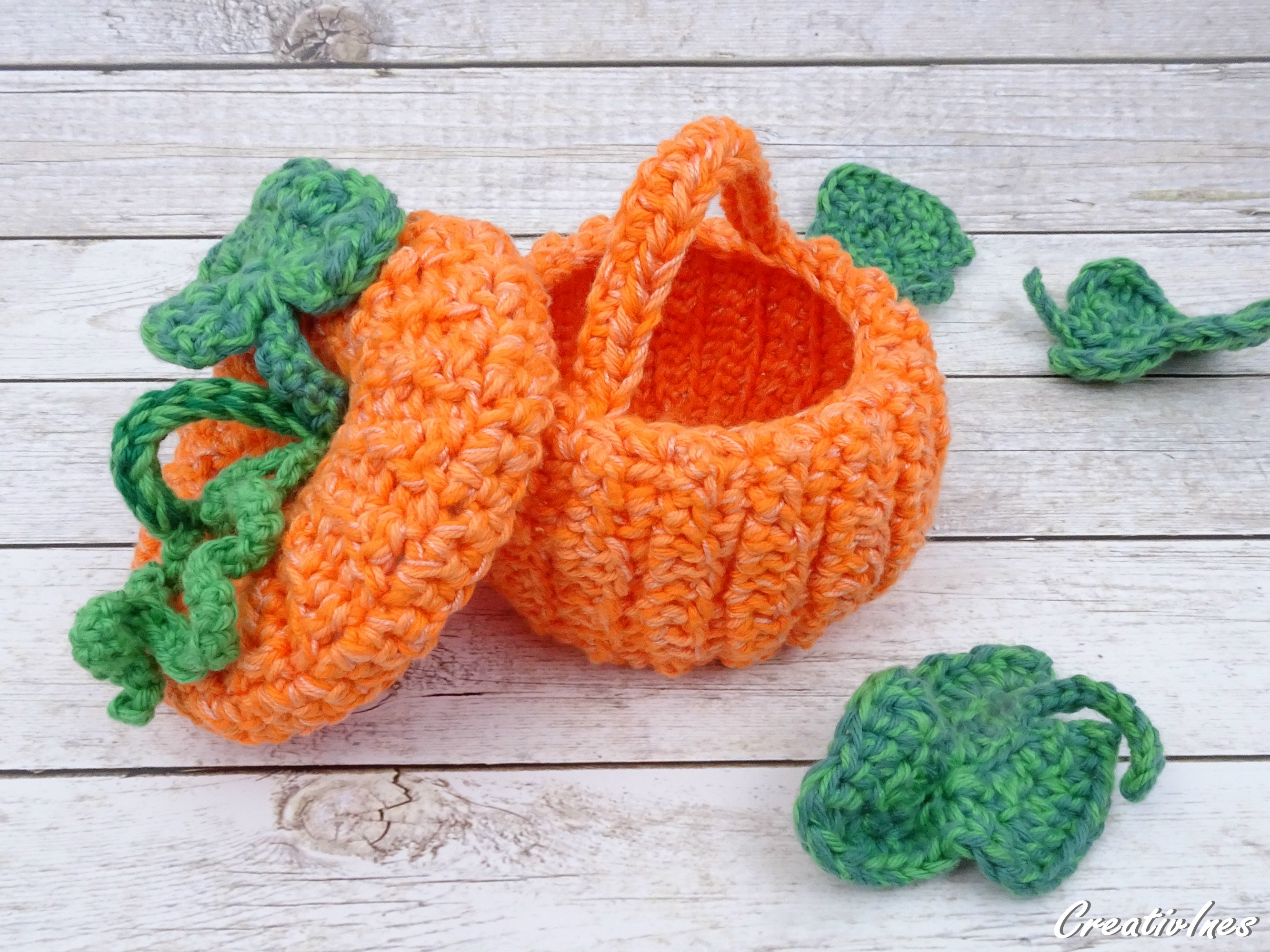 Eine tolle Häkelidee für deine Halloween-Tischdeko sind diese kleinen Kürbiskörbchen, die du wahlweise mit Henkel oder Deckel häkelnkannst. Mehrere Blätter und Ranken sind ebenfalls in der Anleitung enthalten.