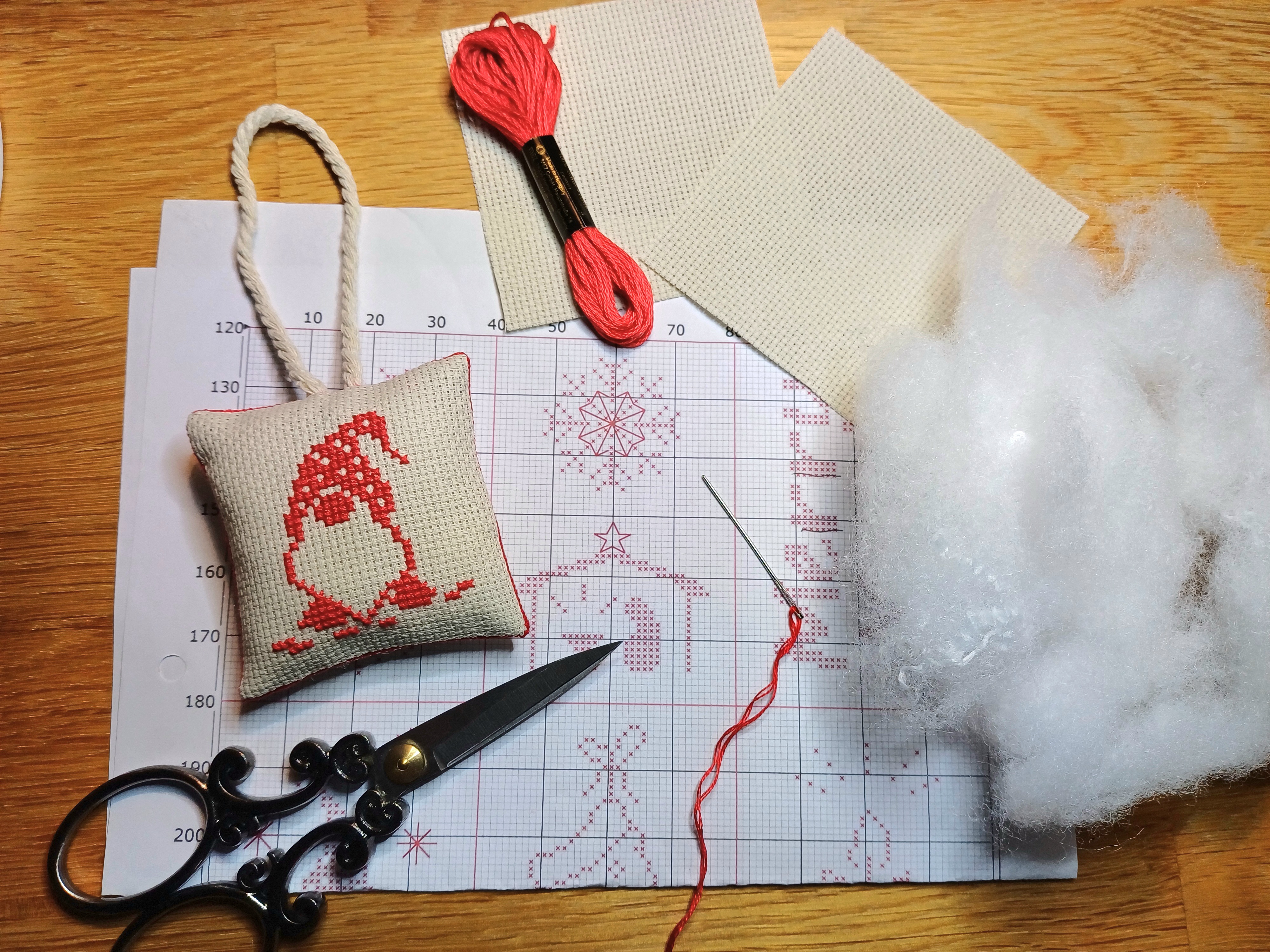 ein Kreuzstichornament als Kissen fertigstellt. Gerade als