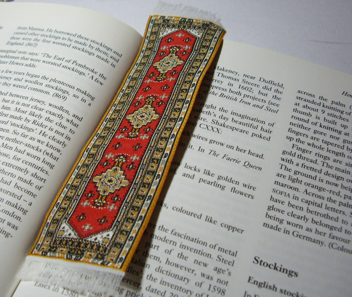 Gehäkelte oder gestrickte oder geknookte oder gesträkelt oder gewebt oder auch gebastelte kleine Teppiche als Lesezeichen.