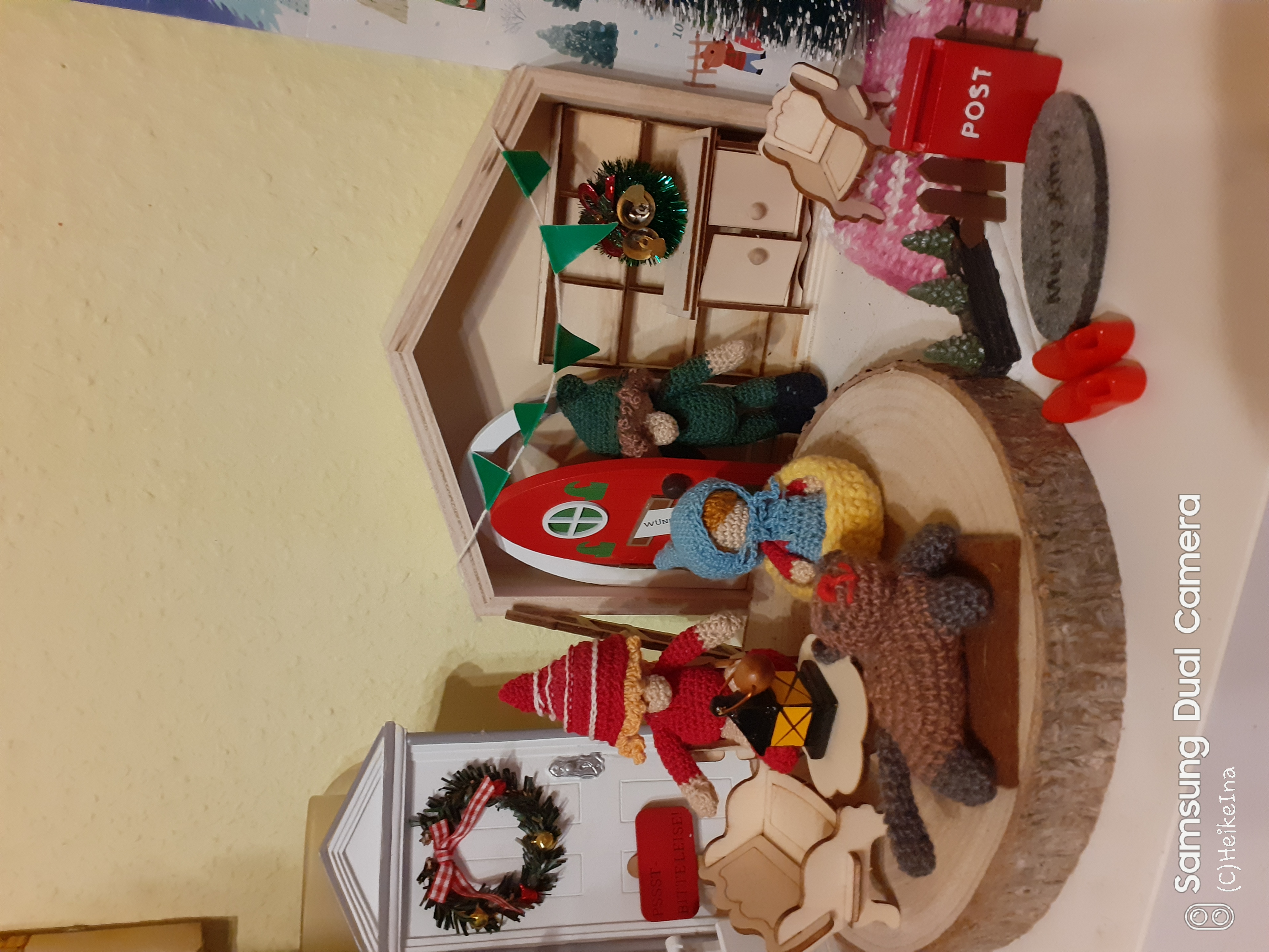 Ich habe meine (mittlerweile) Wichtelfamilie auf einem Regal überm Sofa dekoriert. Die Wichtel hab ich gehäkelt. Hab eine Holzscheibe als Stube, die Tür dahinter. Dazu kleine Möbelchen von Tedi und alles gesammelt, was eben klein ist. Meine Kinder sind längst erwachsen, aber mir macht das immer so viel Freude. Und jedes Jahr kommt etwas neues dazu.