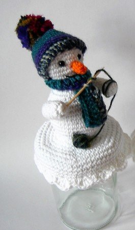 Verschenke ein Bonbonglas mit selbstgemachten Süßigkeiten und einem süßen gehäkelten Schneemann auf dem Deckel! Ist alles aufgegessen, kann das leere Marmeladenglas mit einem LED-Licht oder einer Lichterkette bestückt werden, so dass der
