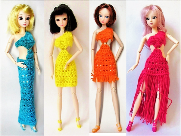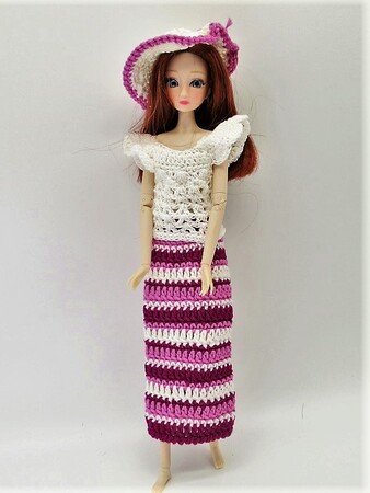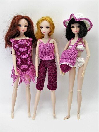 Eine komplette gehäkelte Urlaubsgarderobe für Modepüppchen: 10 Teile, die farblich aufeinender abgestimmt sind und so alle miteinander kombiniert werden können: Bikinioberteil, Bikinihöschen, Spaghetti-Top, Spitzenbluse, Shorts, Caprihose, Fransentunika, Maxirock, Sonnenhut und Strandtasche!