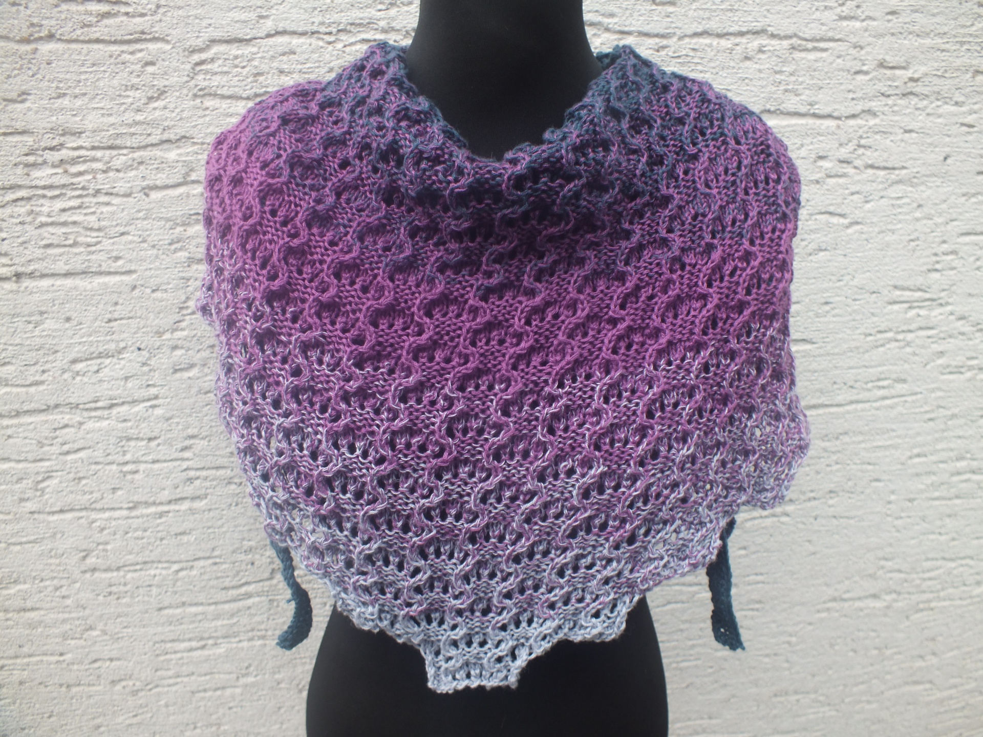 Das Tuch Gnomilaya wird in einem hübschen Reliefmuster gestrickt. Die Zunahmen erfolgen in Stufenform,
