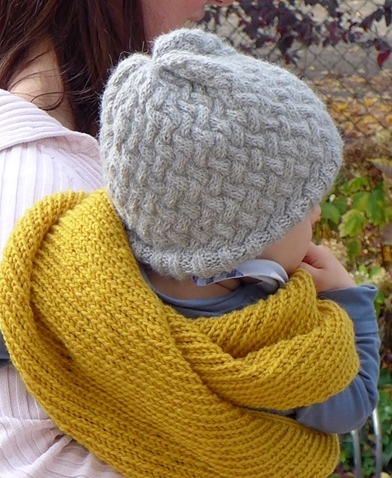 Diese Kindermütze habe in Runden nur aus rechten Maschen gestrickt. Durch das Überkreuzen vor oder hinter der Arbeit entsteht der Flecht-Effekt. Man kommt beim Stricken aber nicht sehr schnell voran. Dafür ist das Gestrick am Ende besonders dick, da sich die Maschen durch das Überkreuzen dichter aneinander drängeln. Also perfekt für eine Wintermütze für die Kids.