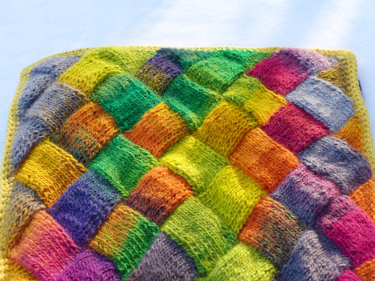 Es gibt aber auch andere Flechtmuster, z. B. Entrelac. Hier strickt man immer nur ein paar rechte Maschen und nimmt dann aus den Seitenkanten wieder neue auf. Das ist eine spezielle Stricktechnik, die besonders schöne Effekte zaubert. Von weitem betrachtet, sieht auch dieses Werk wie geflochten aus. Besonders schön kommt dieses Flechtmuster mit Farbverlaufsgarn zur Wirkung.