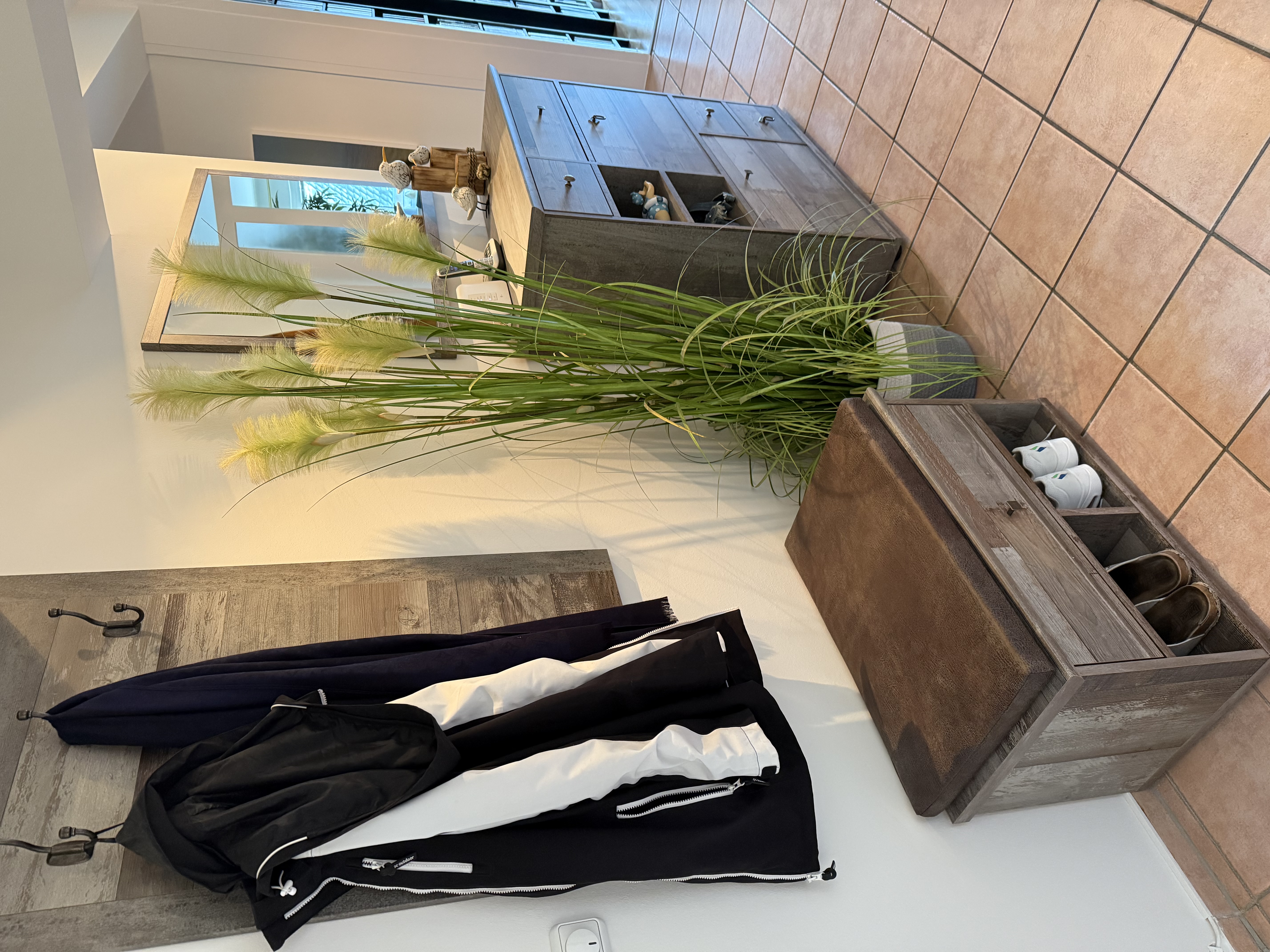 Außerdem ist ein bestellter Soff angekommen. Ich habe ja neue Möbel im Flur, zur Garderobe gehört auch eine kleine Sitzbank, Möbel sind aus Treibholz, und das Kissen auf der Bank ist dunkelbraun, wie doof, schaut mal: