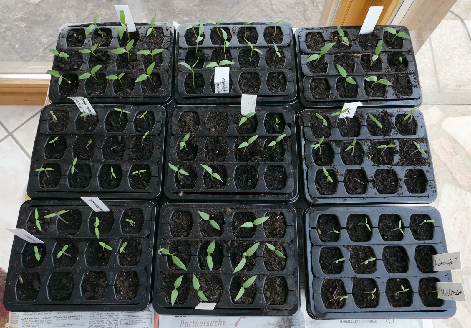Dafür wachsen die Paprika- und Tomatenpflanzen in meinem Wintergarten fleißig. Wenn sie etwas größer sind, bekommt jedes Pflänzchen einen eigenen Blumentopf und dann kommen sie ins kühle Gewächshaus. Bis dahin dürfen sie sich noch im warmen Haus verwöhnen lassen.