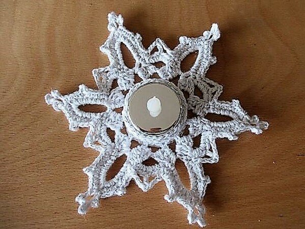 sternenförmigen Teelichthalter ergeben eine stimmungsvolle Tischdekoration. Aus einem Knäuel Baumwolle kannst du etwa 5 Stück davon häkeln. In Weiß passen sie besonders gut bei einer Feier zur Taufe, Kommunion oder Hochzeit. In Rot , Grün oder Gold kann man sie zur Weihnachtszeit verwenden, und für den Frühling und Sommer passen knallbunte Farben. Du siehst also, dies ist ein ideales Wollrestprojekt!