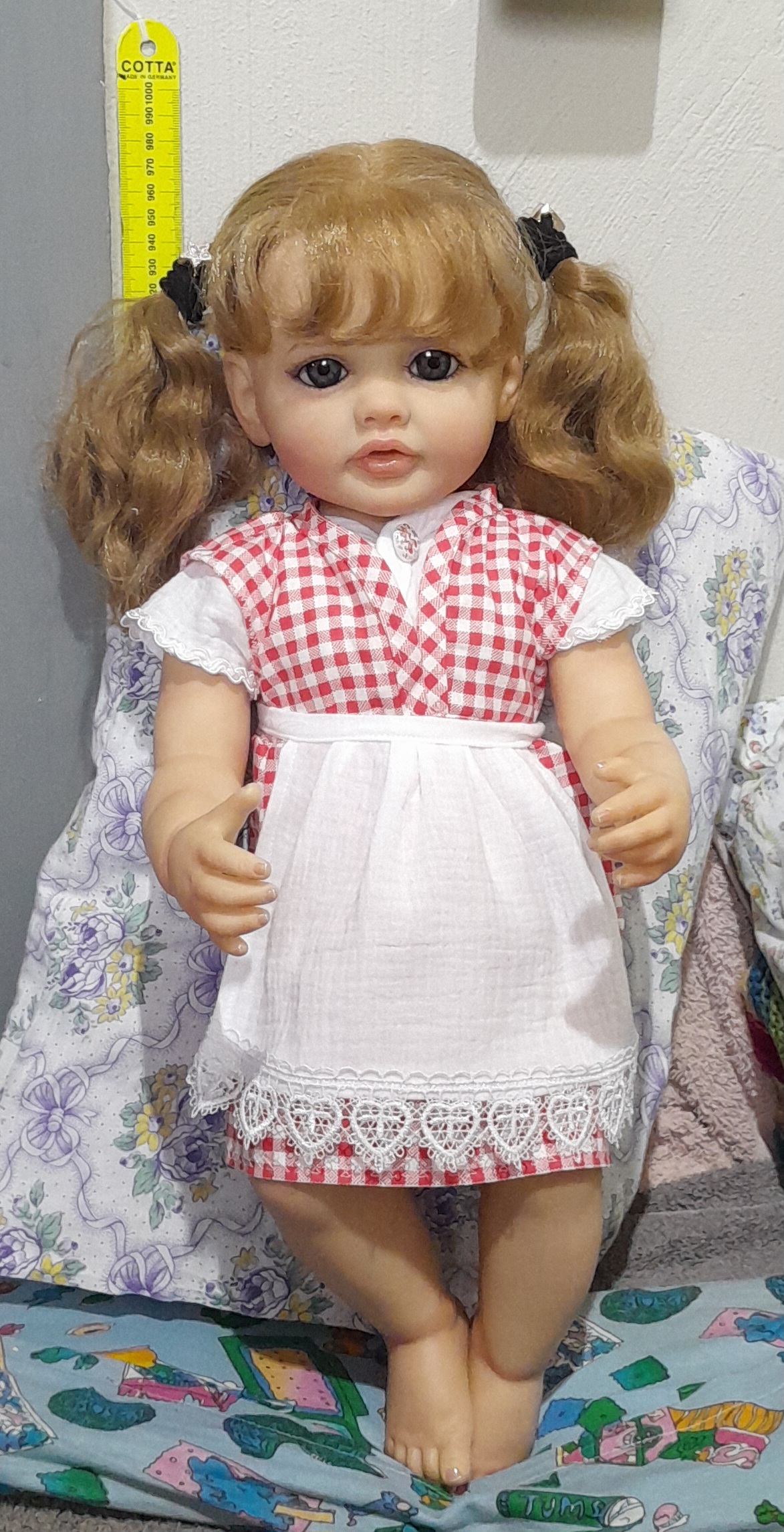 Besonders gut gefällt mir die Schürze mit der Spitze dran. Und die Spitze ist dann auch noch an der Blüte. Dazu das karierte Kleid. Sehr fesch. Alle Puppenbesitzerinnen beneiden dich um diese schöne Kleidung ... und dein Talent.