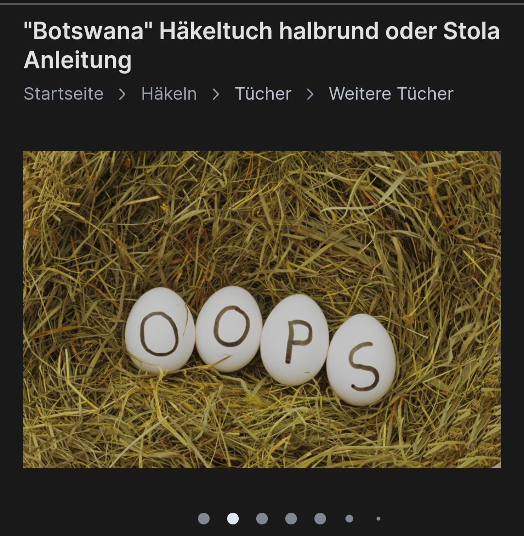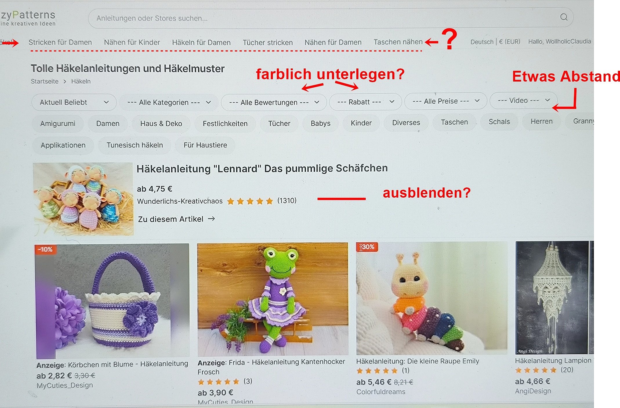 wenn ich ein Produkt angeklickt habe, stehen oben  nur noch 8 Auswahlmöglichkeiten, also z.B. Amigurumi häkeln ist da, Häkeln für Damen auch, Tücher stricken, aber nicht allgemein häkeln oder Häkeln für Herren.