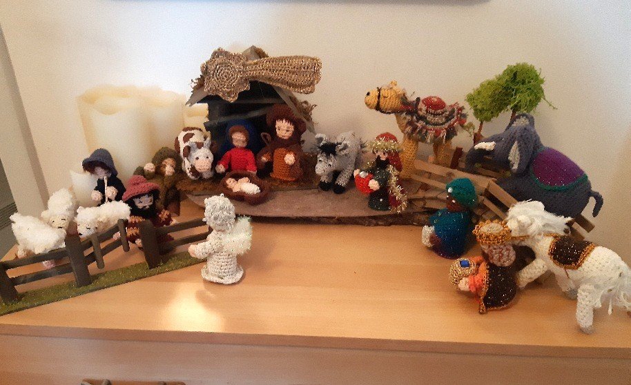 Heilige Familie . Die Häkelanleitung beinhaltet die Beschreibung für Maria, Josef, das Christkind in der Krippe, den Weihnachtsstern, sowie Ochse und Esel.