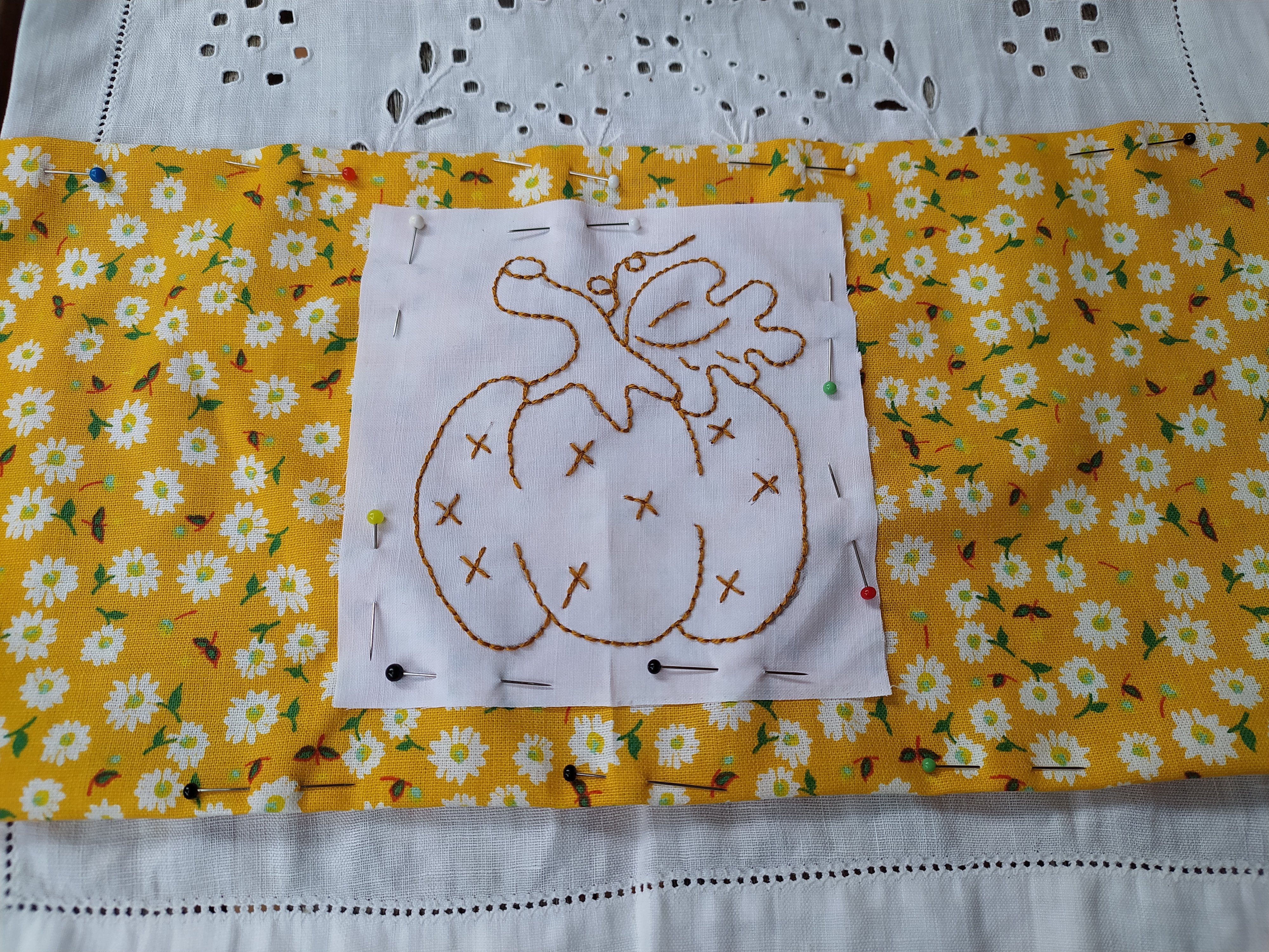 Wenn du ein Vlies hinter das Kürbismotiv nähst, wird das Licht dort nicht genügend durchscheinen - so meine Annahme. Vielleicht könntest du das Kürbismotiv rundherum auf den bunten Stoff steppen ... und dann von hinten den bunten Stoff dort - knapp neben der Naht - wieder entfernen?