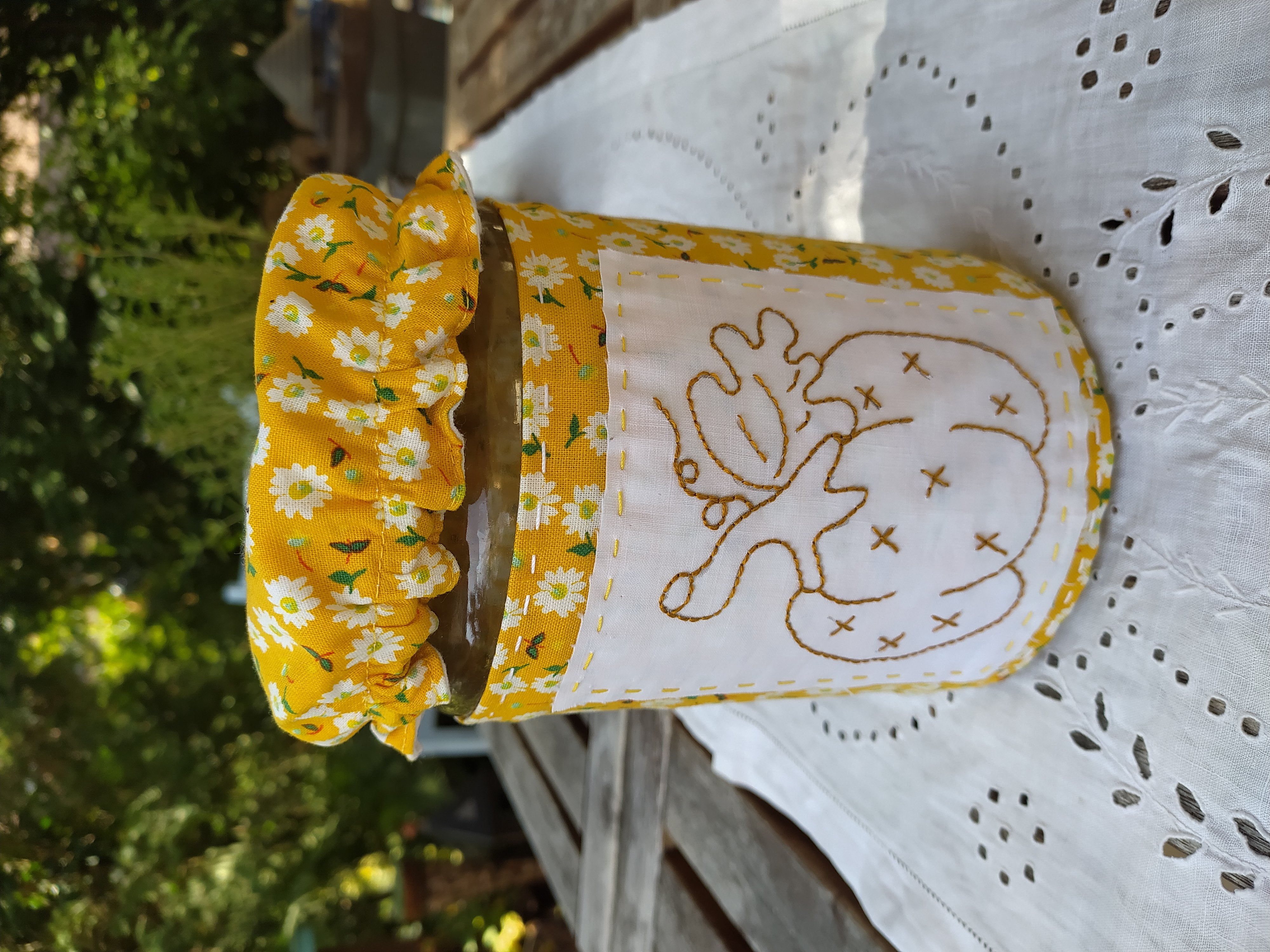 Das ist schön geworden, liebe Petra. So mit dem bezogenen Deckel mit Häubchen und dem sichtbaren Stichen - das gefällt mir. Das gestickte Kürbismotiv passt wunderbar zum Stoff.