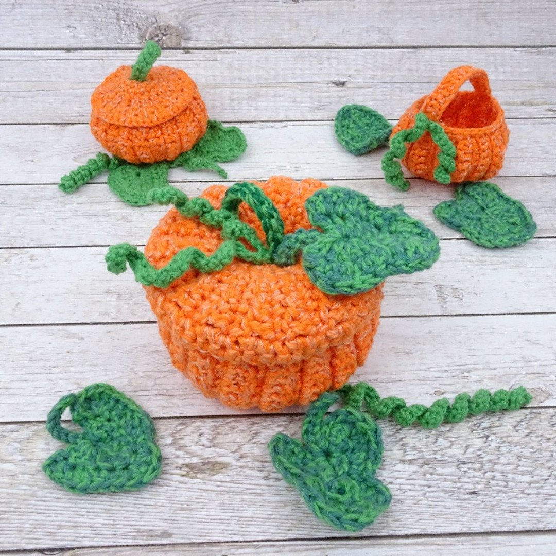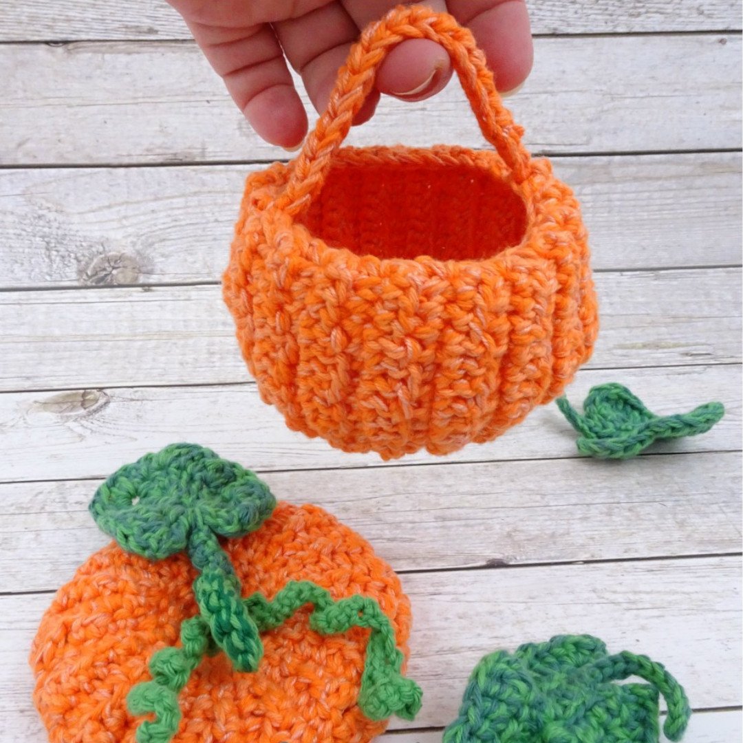 Häkelanleitung umfasst mehrere Variationen an Kürbiskörbchen: