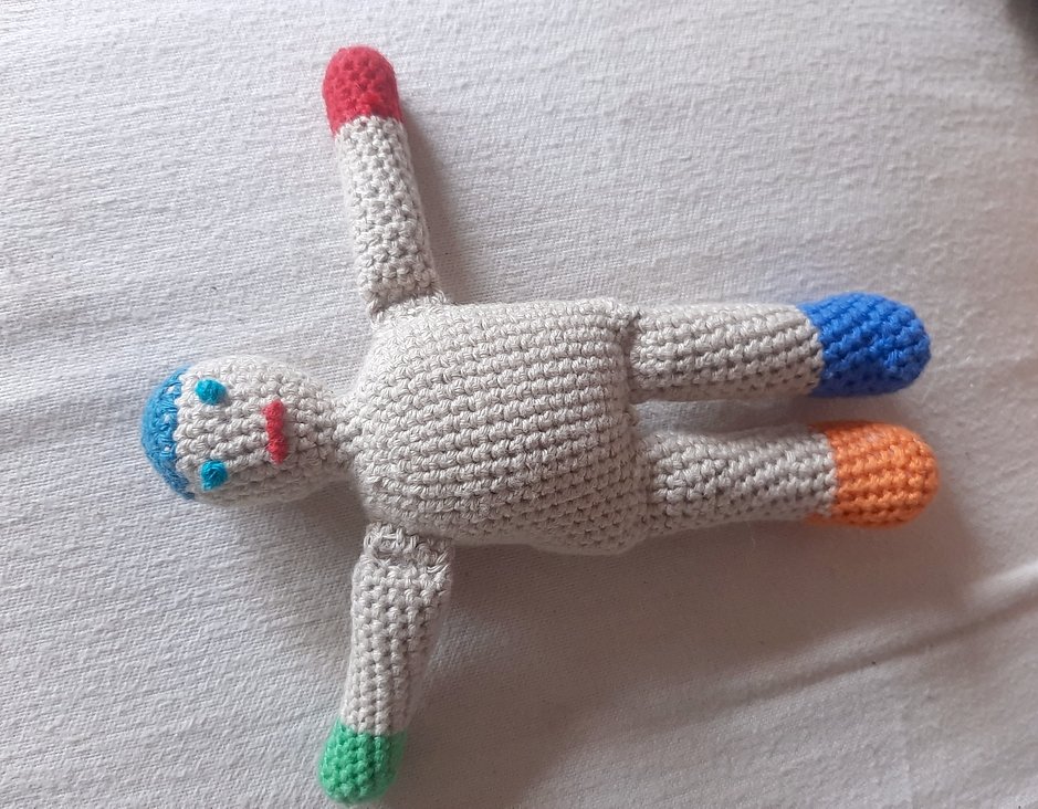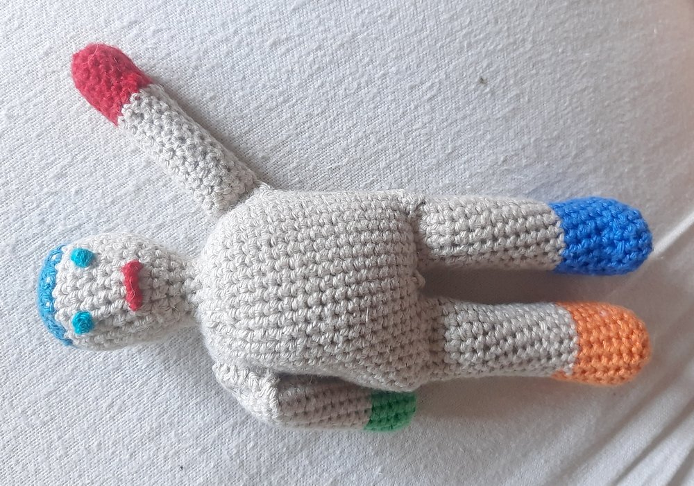 Beine und Arme wurden separat gehäkelt, Rumpf, Hals und Kopf in einem Stück, wobei der Rumpf direkt auf die Beine draufgehäkelt wird mit 3 LM in der Mitte und von dort dann in Runden nach oben. Zur besseren Beweglichkeit wurden die Arme nach dem Füllen mit fM zusammengehäkelt und dann noch eine Reihe fM draufgesetzt. Arme und Beine sind relativ fest gefüllt, Körper und Kopf sind sehr weich. Aus hygienischen Gründen wählte ich ein Baumwollgarn, dass bei 60° C gewaschen werden kann. Die Füllung ist kochfest und hypoallergen.