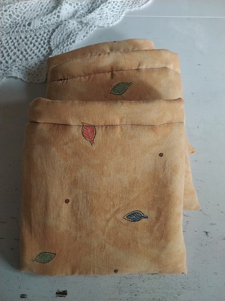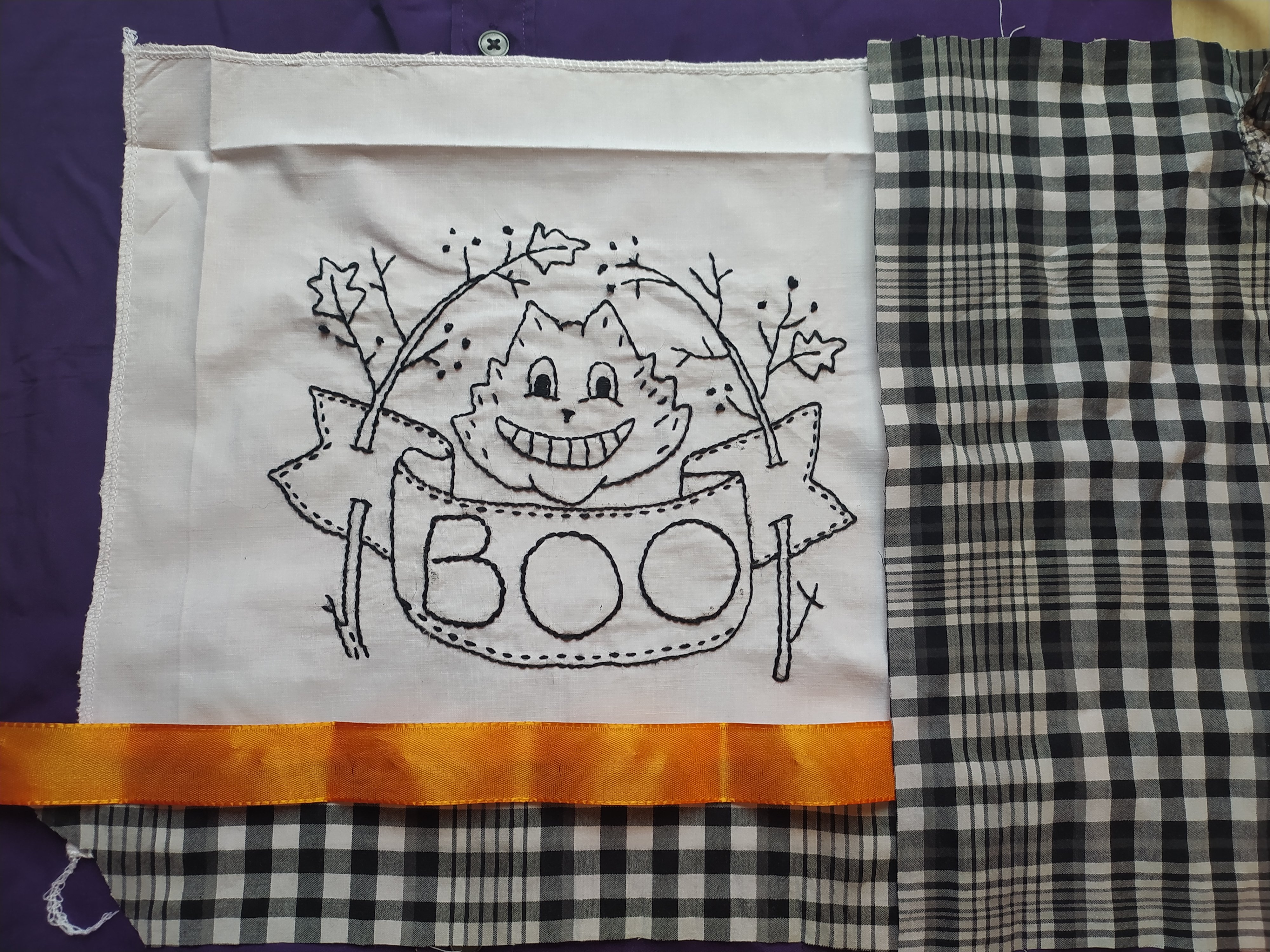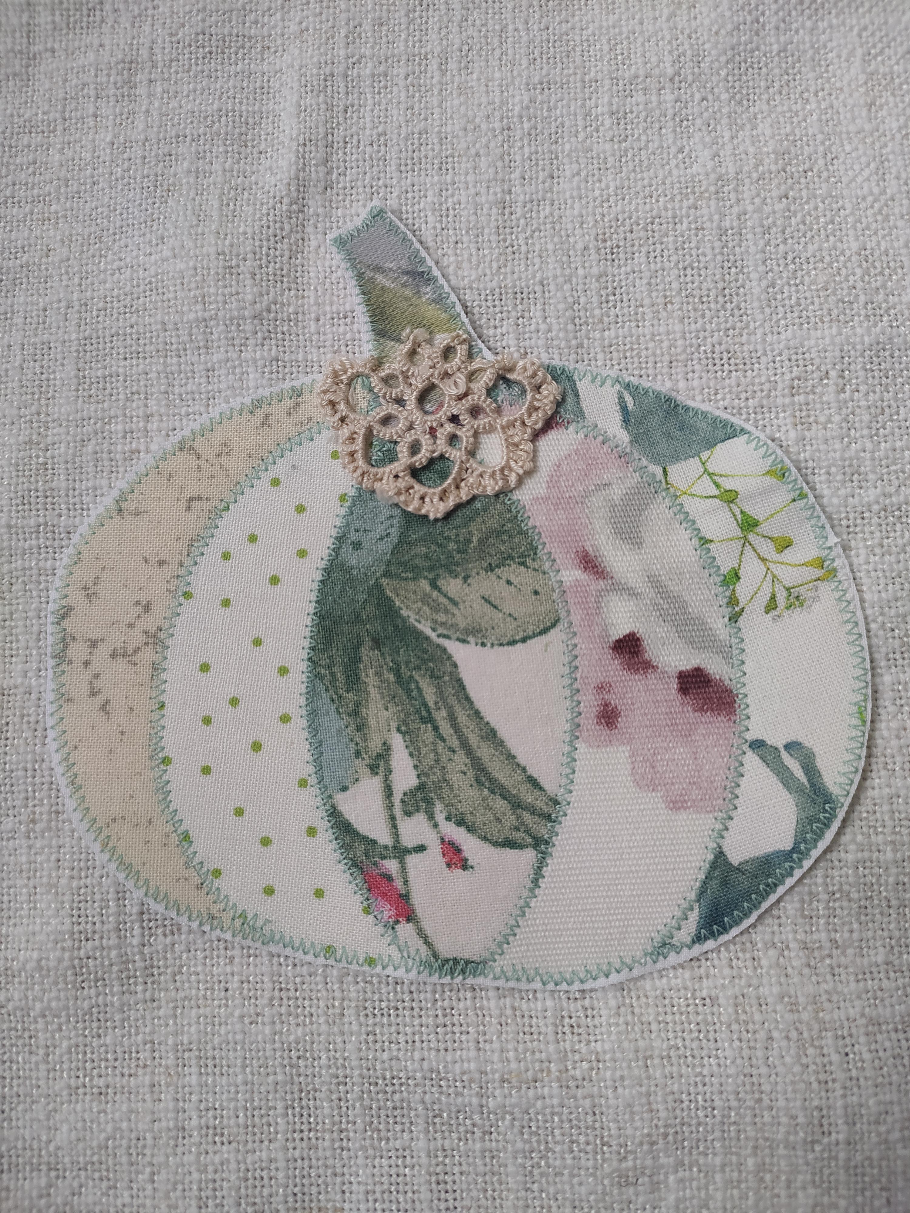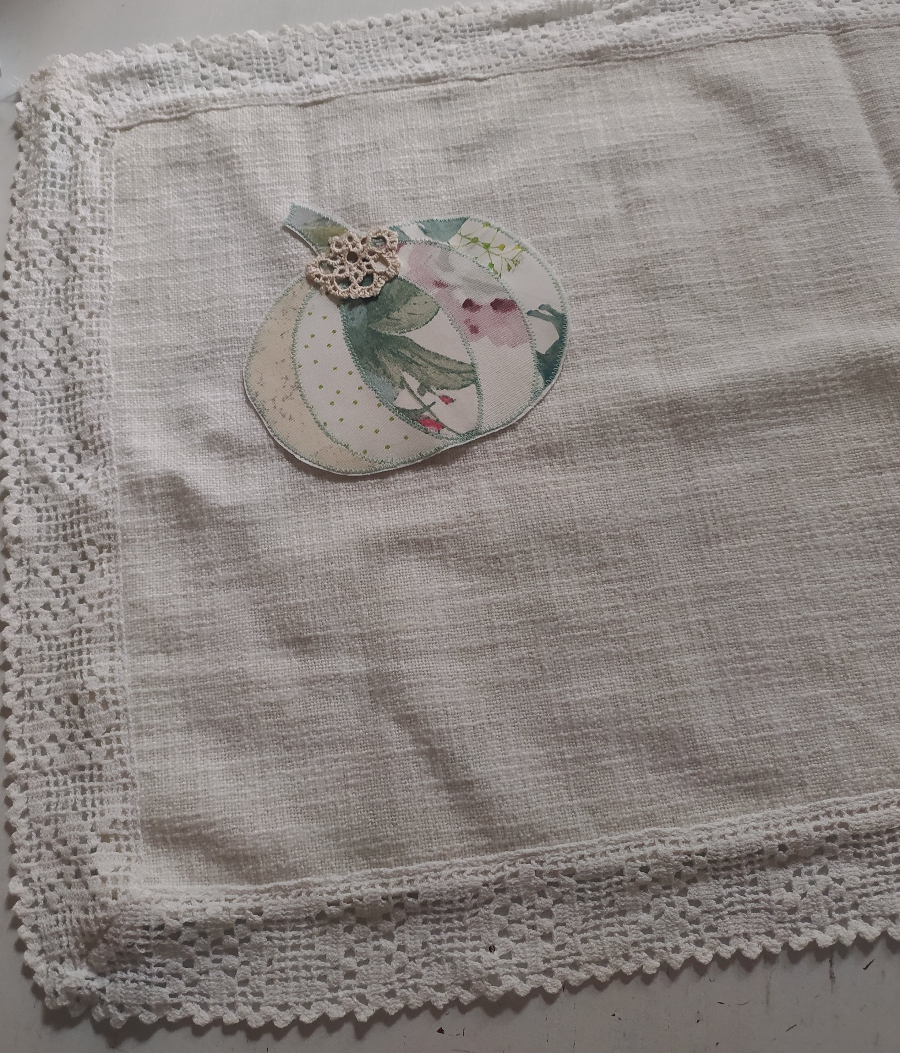Dann habe ich gestern einen kleinen Kürbis genäht. Zuerst sollte es ein Tassenuntersetzer werden, im Moment wird es aber vielleicht ein Herbstlicher Tischläufer. Der Tischläufer ist vom Diakonieladen für 1 Euro, schön grob der Stoff mit einer tollen Spitze außenrum.