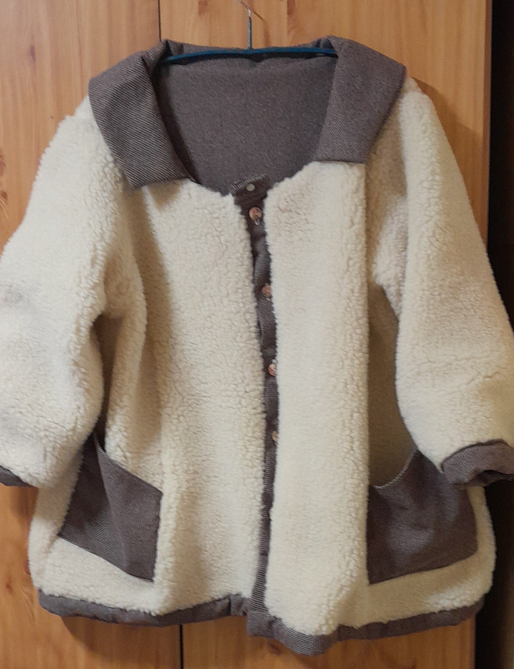 Ina, Danke, das ist reine Schaf- Schurwolle als Plüsch verarbeitet, so einenn Soff bekam ich vor ein paar Jahren schonmal geschenkt vom Göga, da hatte ich mir einen warmen Hausmantel von genäht. Das Futter der Jacke ist Flanell von Buttinette .