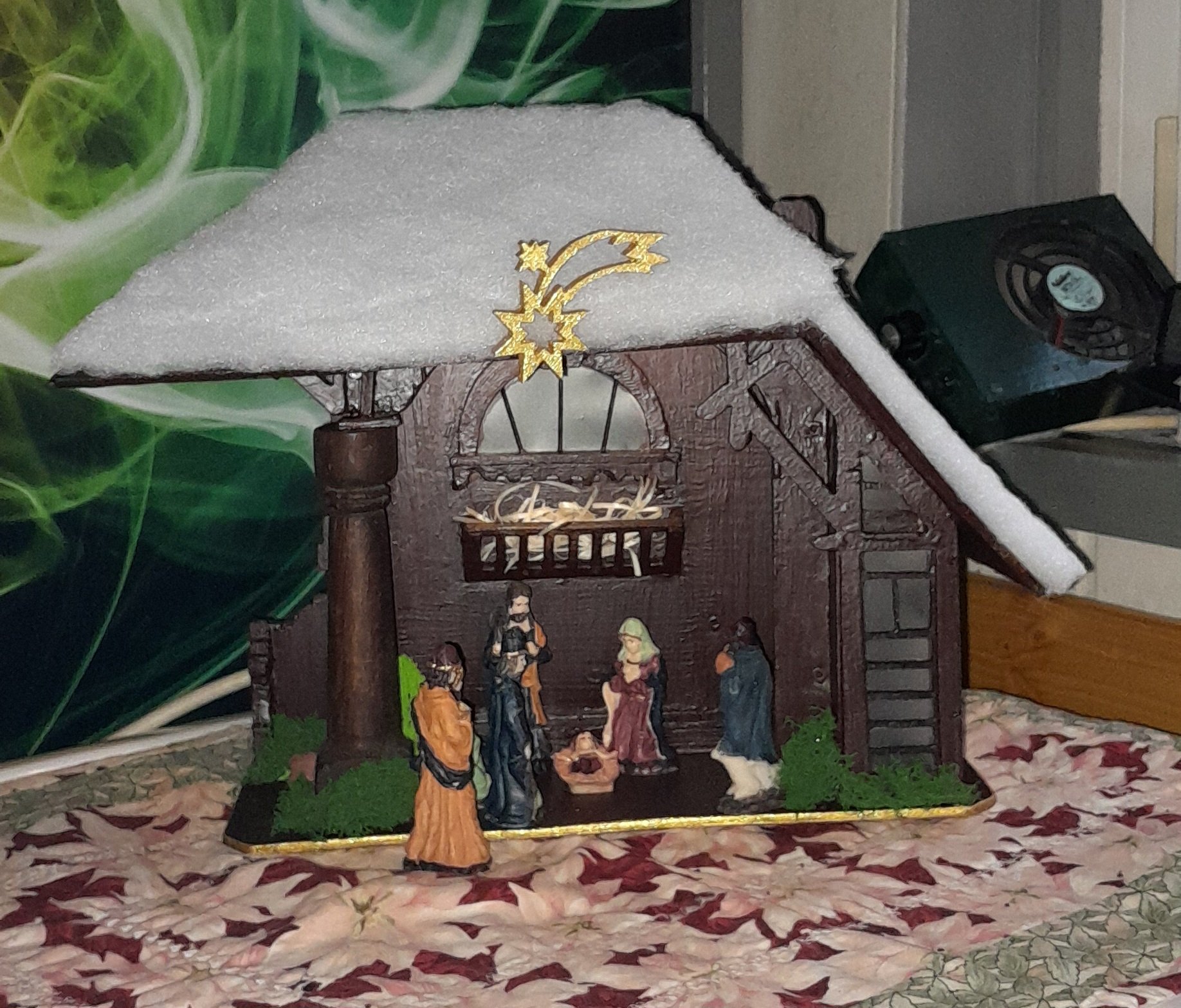 Dafür habe ich, als mein Sohn geboren wurde, aus Modelliermasse Krippenfiguren gebastelt. Als dann die Tochter auf die Welt kam hat mein Mann den Krippenstall dazu gezimmert. Im Laufe der Jahre kamen dann immer wieder ein paar Ergänzungen dazu. Und dieses Kripperl ist jetzt immerhin auch schon 48 Jahre alt und wird jedes Jahr im Wohnzimmer aufgestellt.