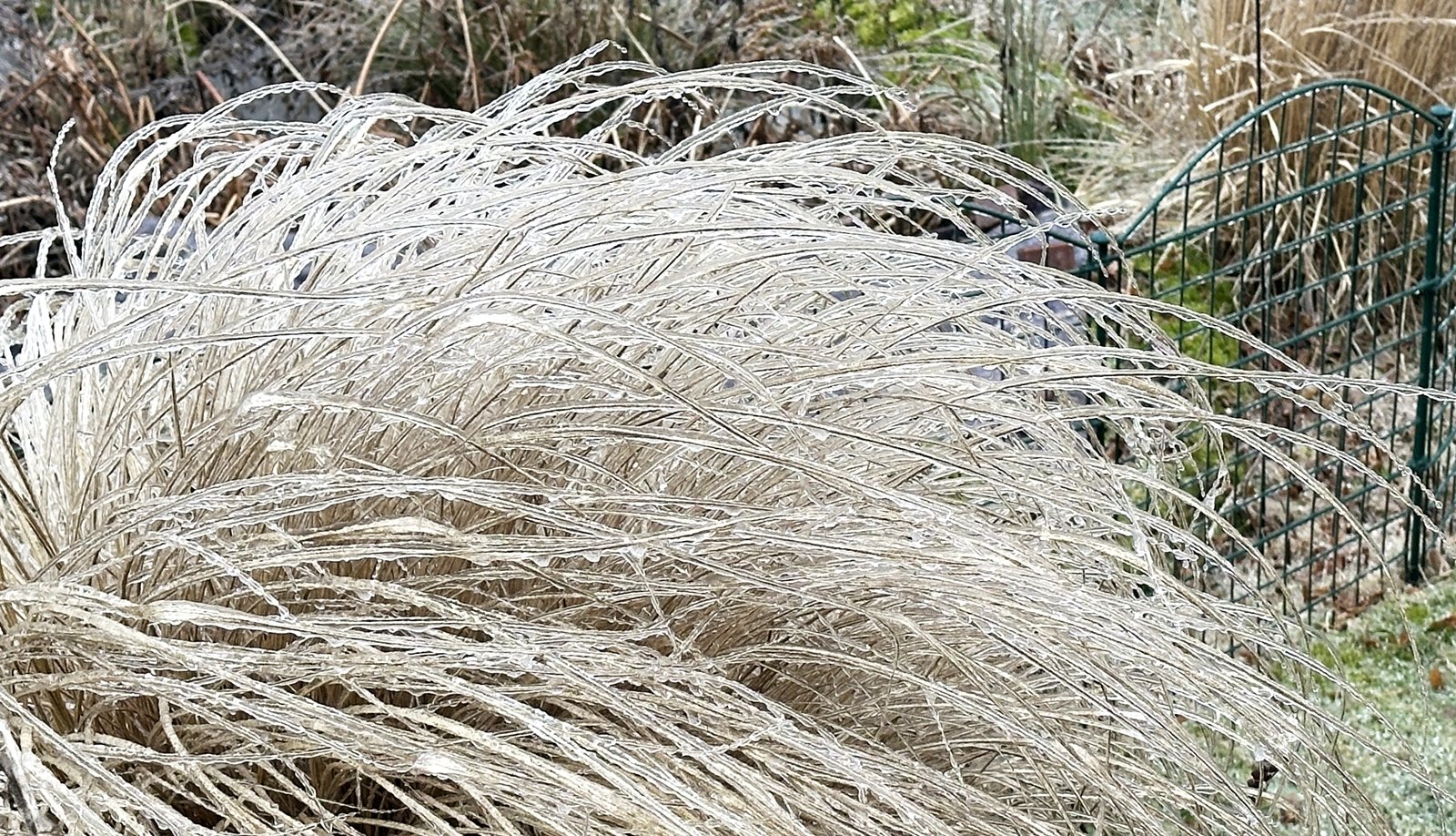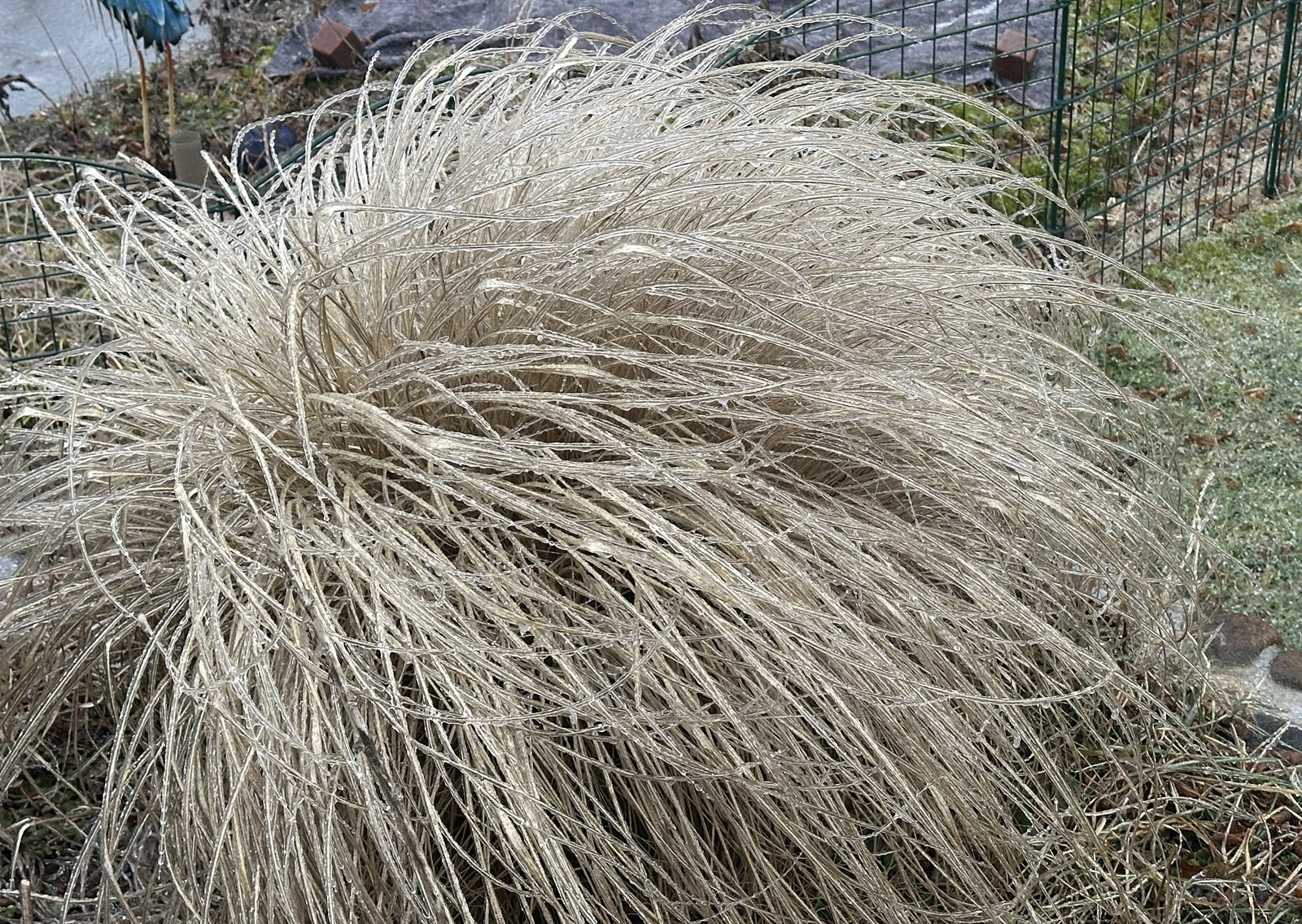 Seht man, mein Lampenputzergras. Erst hat der eisige Wind es in die richtige Position gepustet, dann kam der Eisregen und dann ist alles wie in Zeitlupe eingefroren.