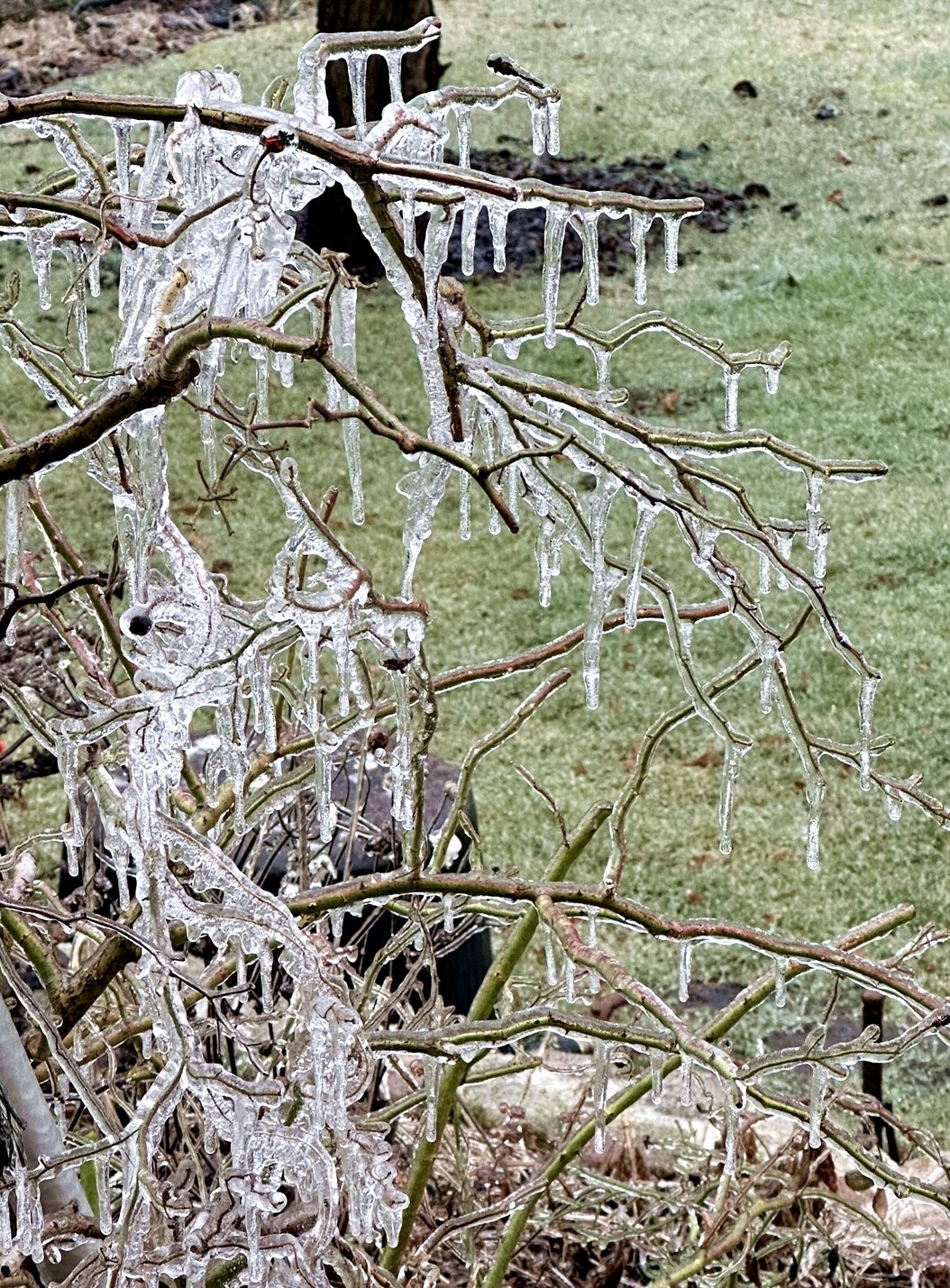 Wir hatten heute Nacht Eisregen. Entsprechend spiegelglatt war es auf Straßen und Wegen. Wenn man nicht raus musste, konnte man sich an bizarren Eiszapfen erfreuen.