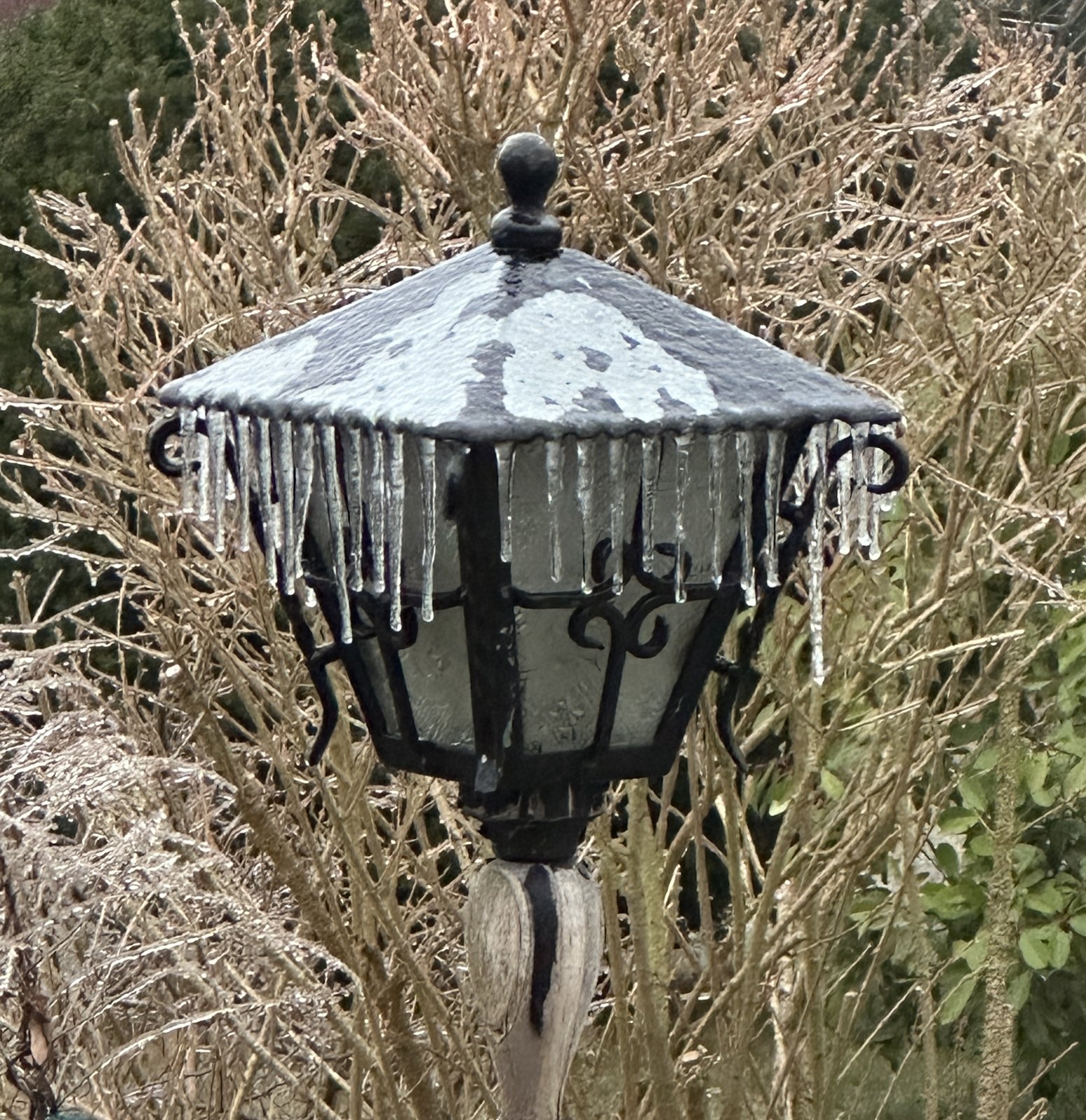 Überall hat es Eiszapfen gebildet: an unserer Kletterrose und auch an der Gartenlampe: