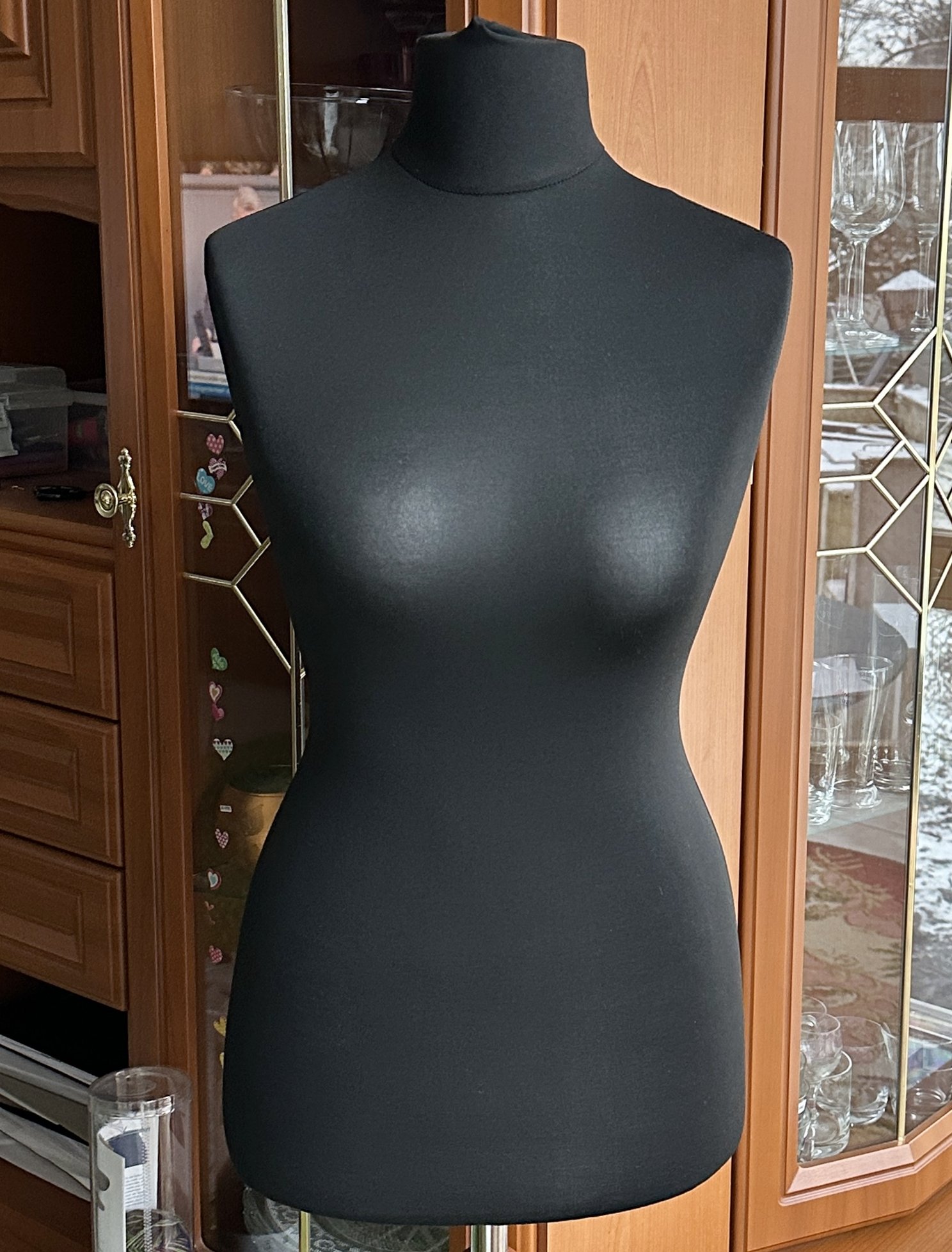 Als ich die Styropor-Kleiderpuppe gekauft habe, hatte sie einen sattschwarzen Stoff-Überzug. So konnte ich den Fehler nicht sehen. Nach nur kurzer Benutzung ist der schwarze Stoff nun extrem durchscheinend geworden - und siehe da, das Malheur wird sichtbar.