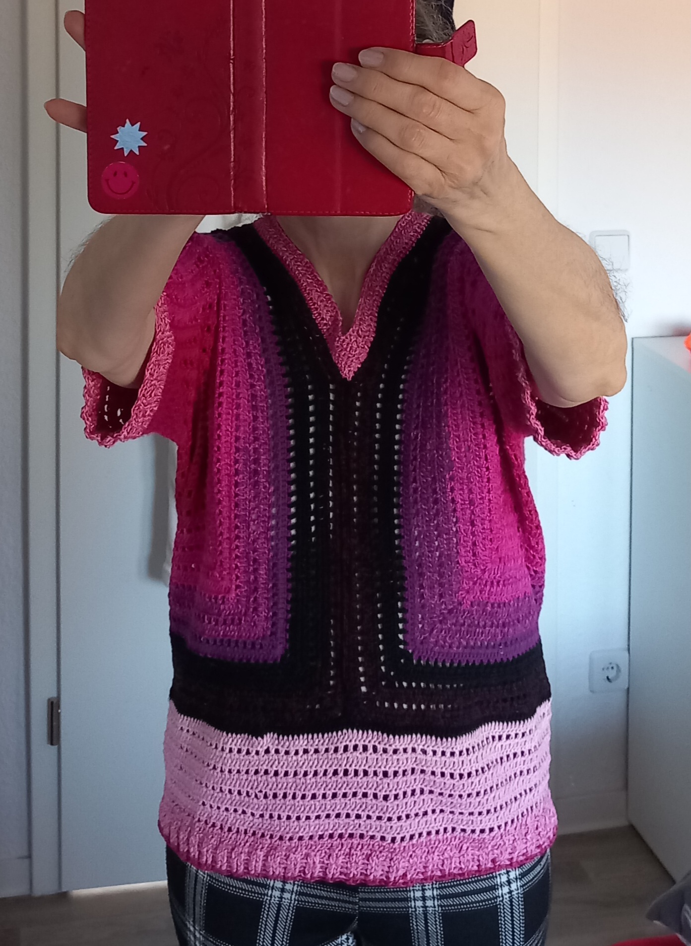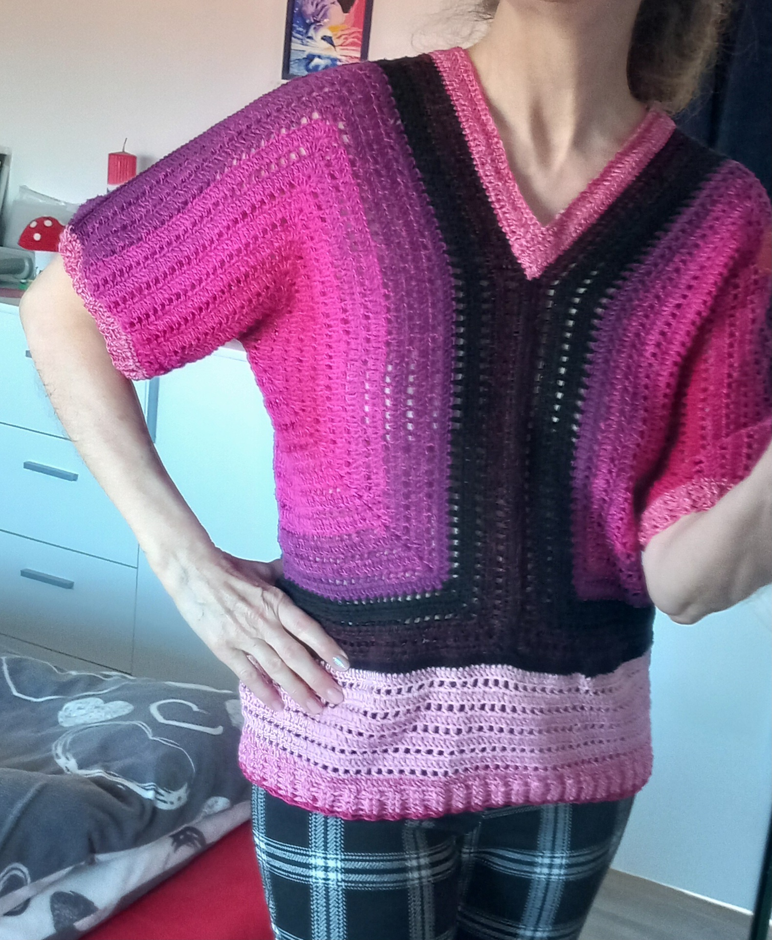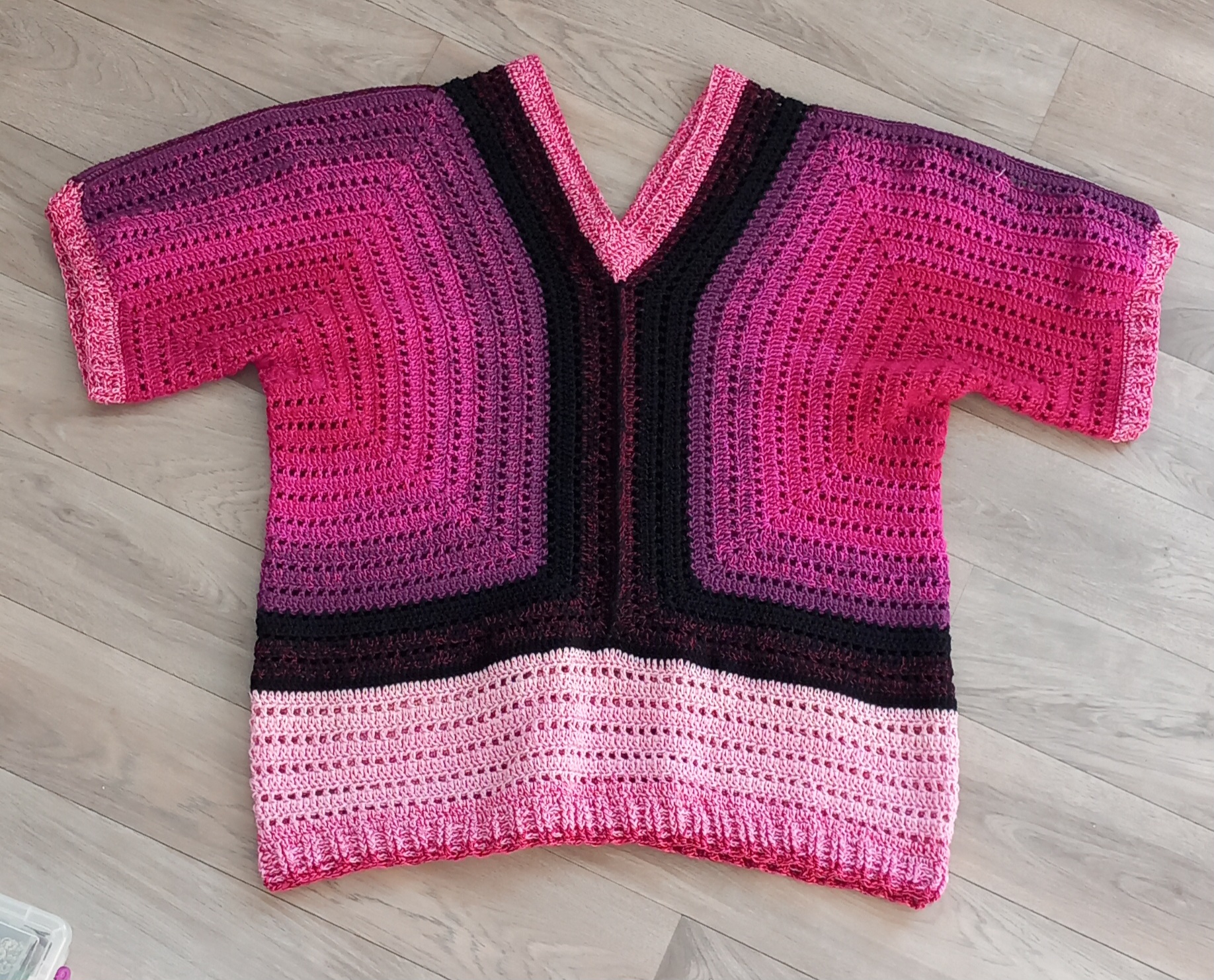 Ein Granny-OT für mich, welches sein Dasein in der Wollbox hatte. Irgendwann vor einem Jahr begonnen. Gehäkelt ohne AL aus Garn- und Bobbelresten.