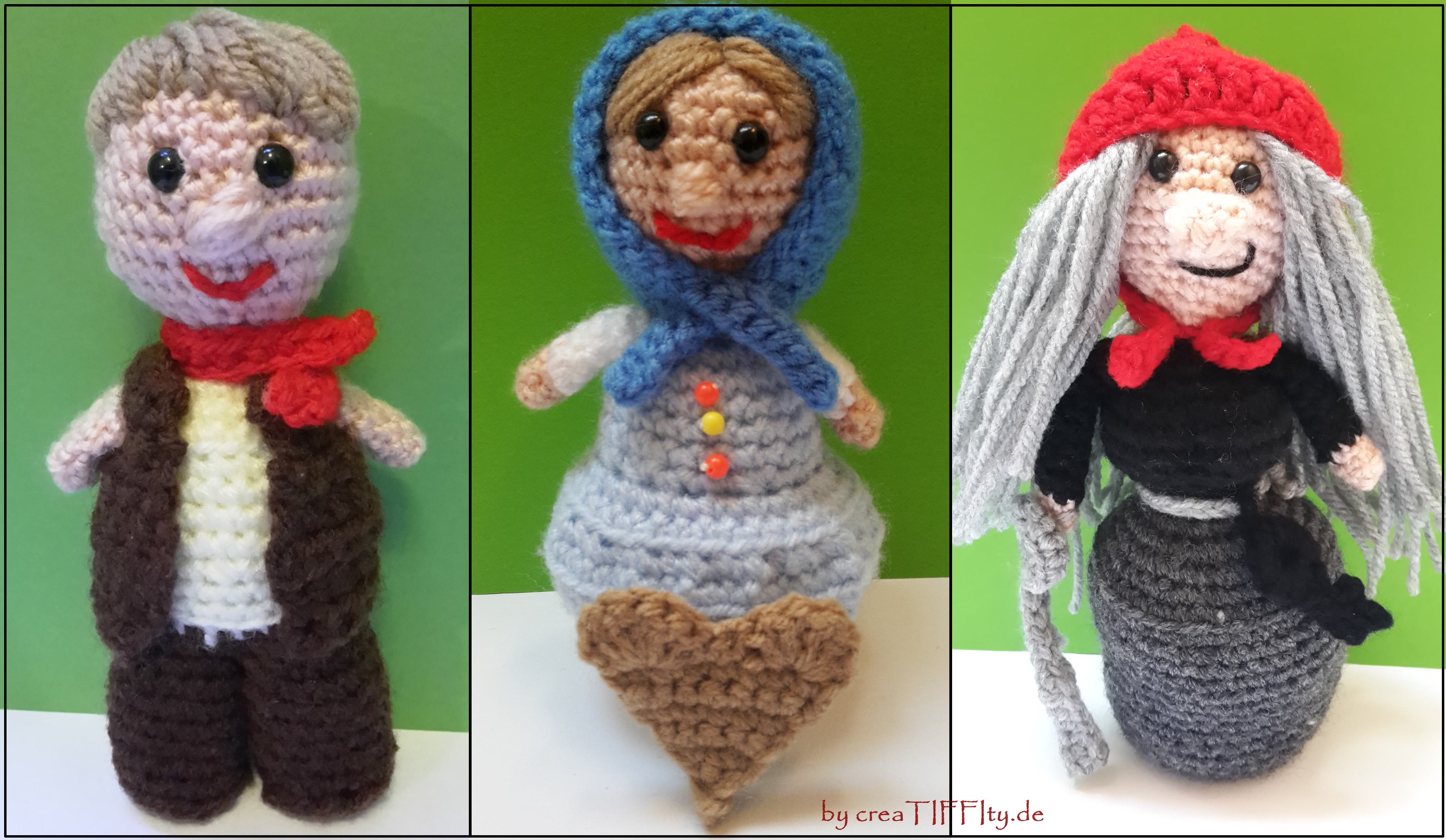 Hier kommen die 3 Figuren. Perfekt für das Puppenhaus oder als Dekoration. Sie sind 12 - 16 cm groß, schnell aus Wollresten gehäkelt und für geübte Anfänger geeignet.