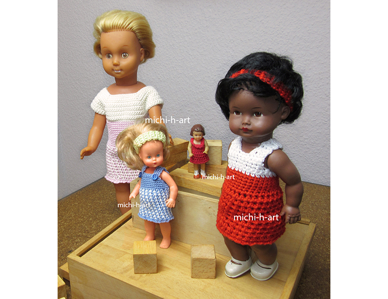 Ich habe mit diesen Kleidern Puppen mit einer Größe von 7 cm bis 42 cm eingekleidet.Die Kleider bestehen aus Luftmaschen, Kettmaschen, festen Maschen und halben Stäbchen.Die kleinsten einfarbigen Kleidchen sind an einem Stück durchgehäkelt, d.h., es brauchen nur der Anfangs- und Endfaden vernäht