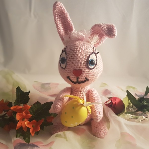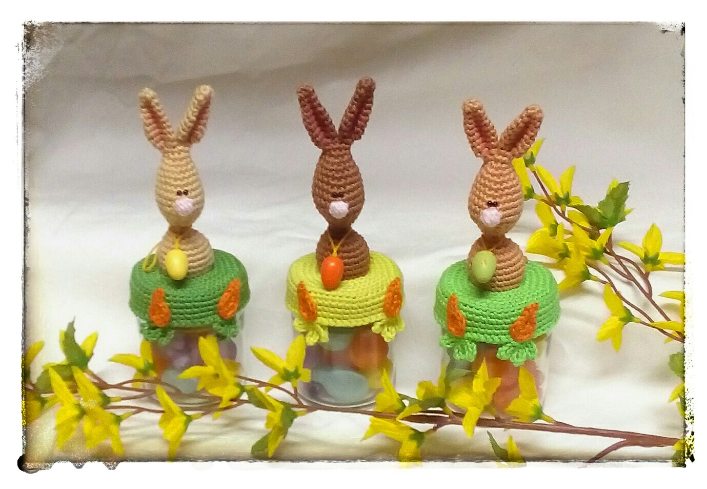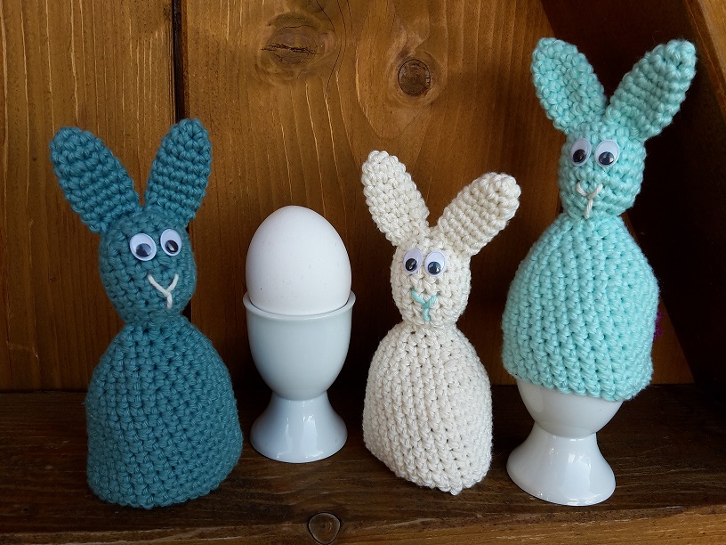 Häkelanleitung für einen Osterhasen mit drei Ostereiern