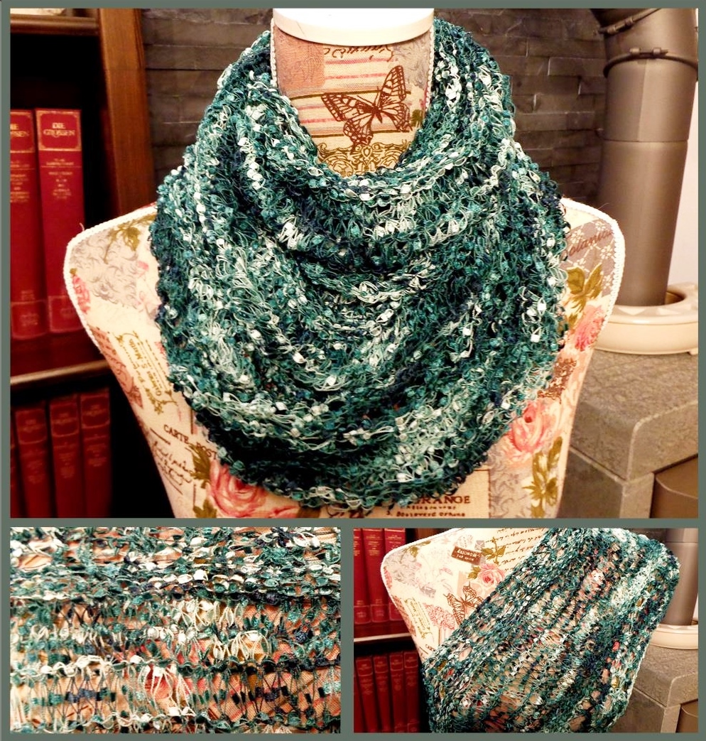 225 g KidSilk von Austermann, Farbe 40 Smaragd, 75 % Kidmohair, 25 % Seide,Angaben lt. Banderole: Nd. 3 – 4, 18 Ms x 26 R = 10 cm x 10 cm, Handwäsche, 25 g – 225 m Lauflänge;