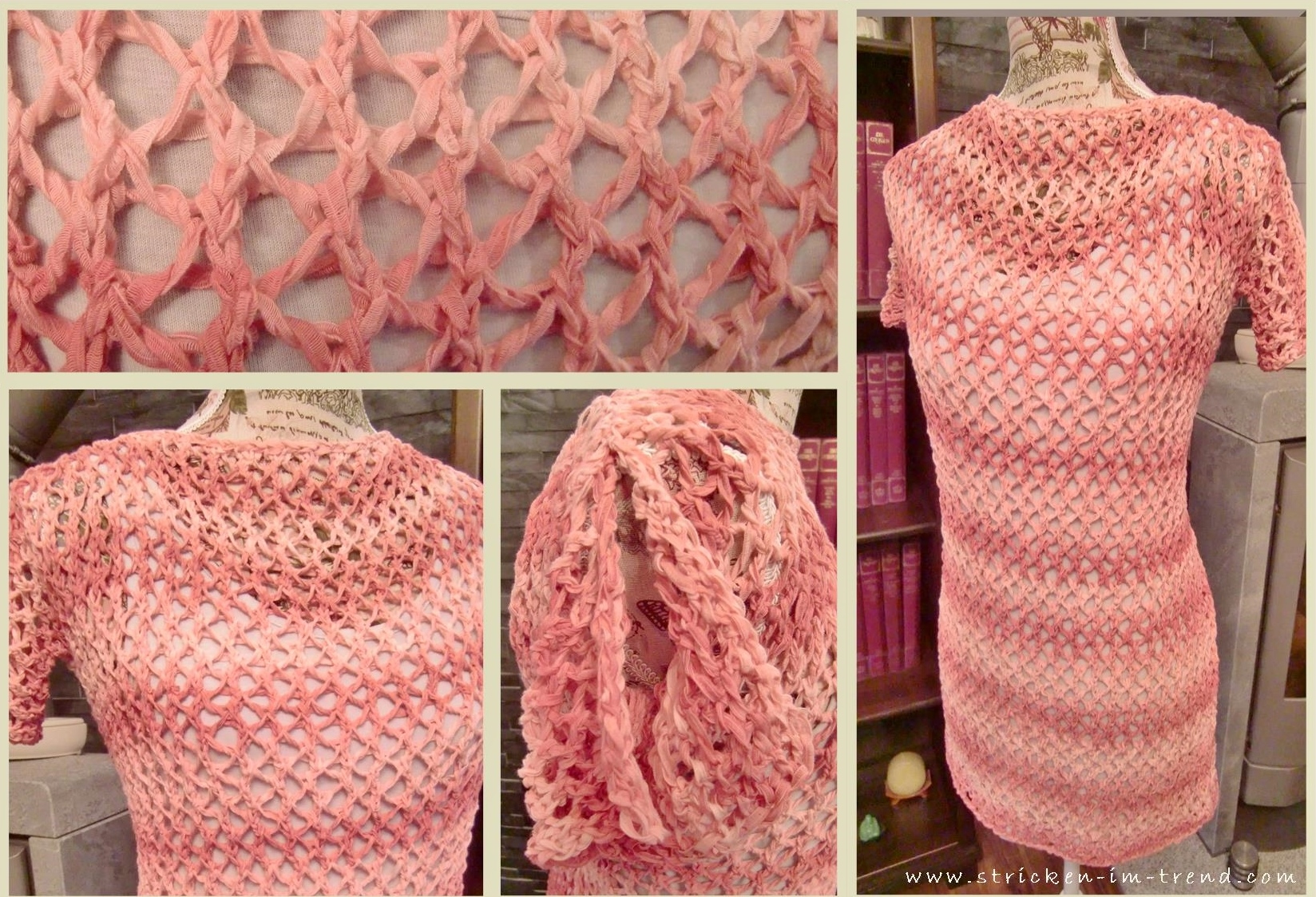 Das fertige Shirt hat eine dehnbare Rückenbreite von ca. 44 cm und ist ca. 65 cm lang, sieht aber auch kürzer hübsch aus. Aufgrund des einfachen Musters (aus Umschlägen, rechten und linken Maschen) und Schnitts lässt sich dieses Teil auf jede Größe leicht anpassen.
