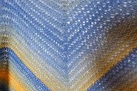 z.B. Kid-Seta (Schulana) oder Kid Mohair bzw. KidSilk (Adriafil) – jeweils dieselbe Menge für die hier gestrickte Gesamt-Rückenlänge von ca. 71 cm. In diesem Material wird mit doppeltem Faden gestrickt.